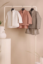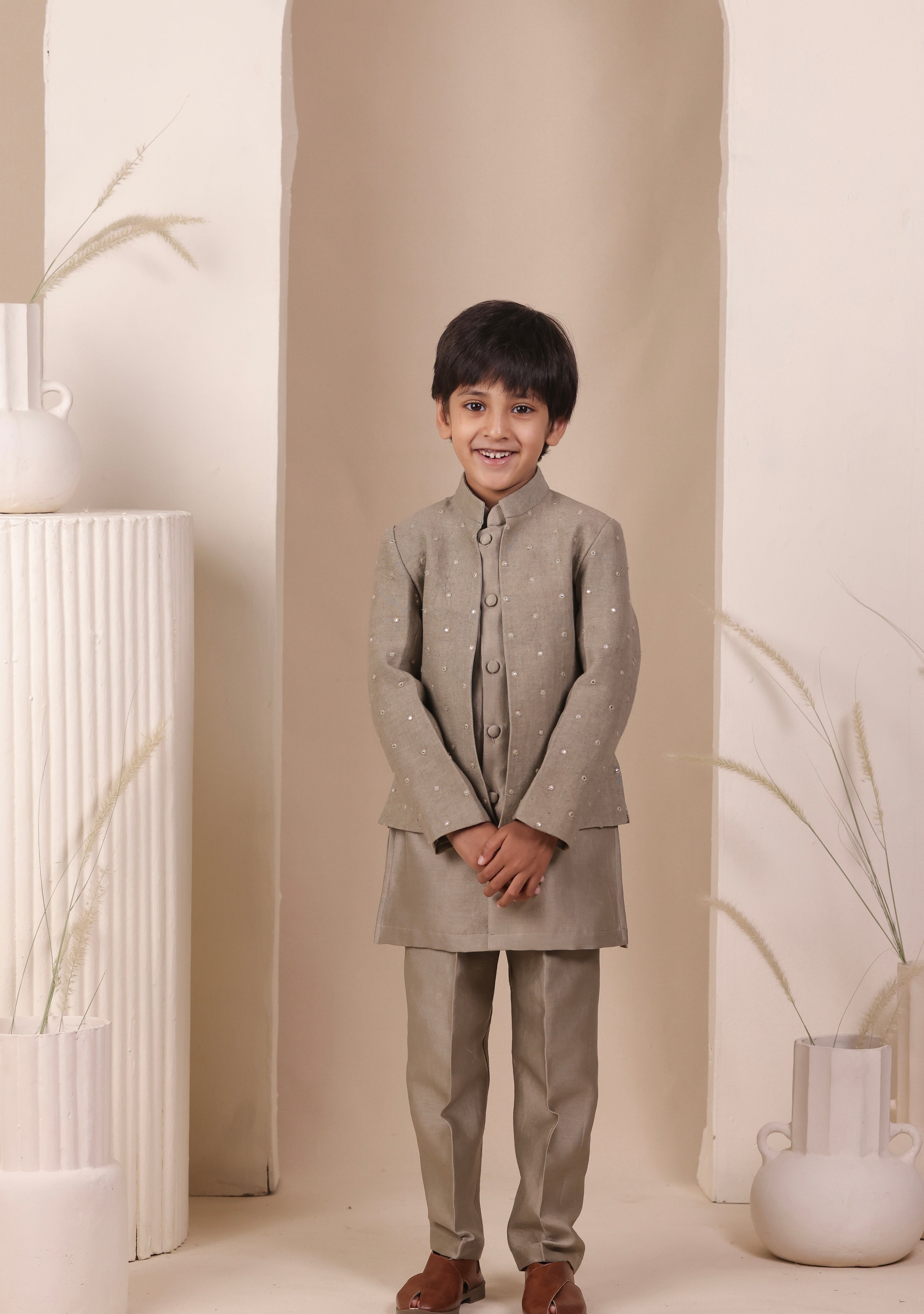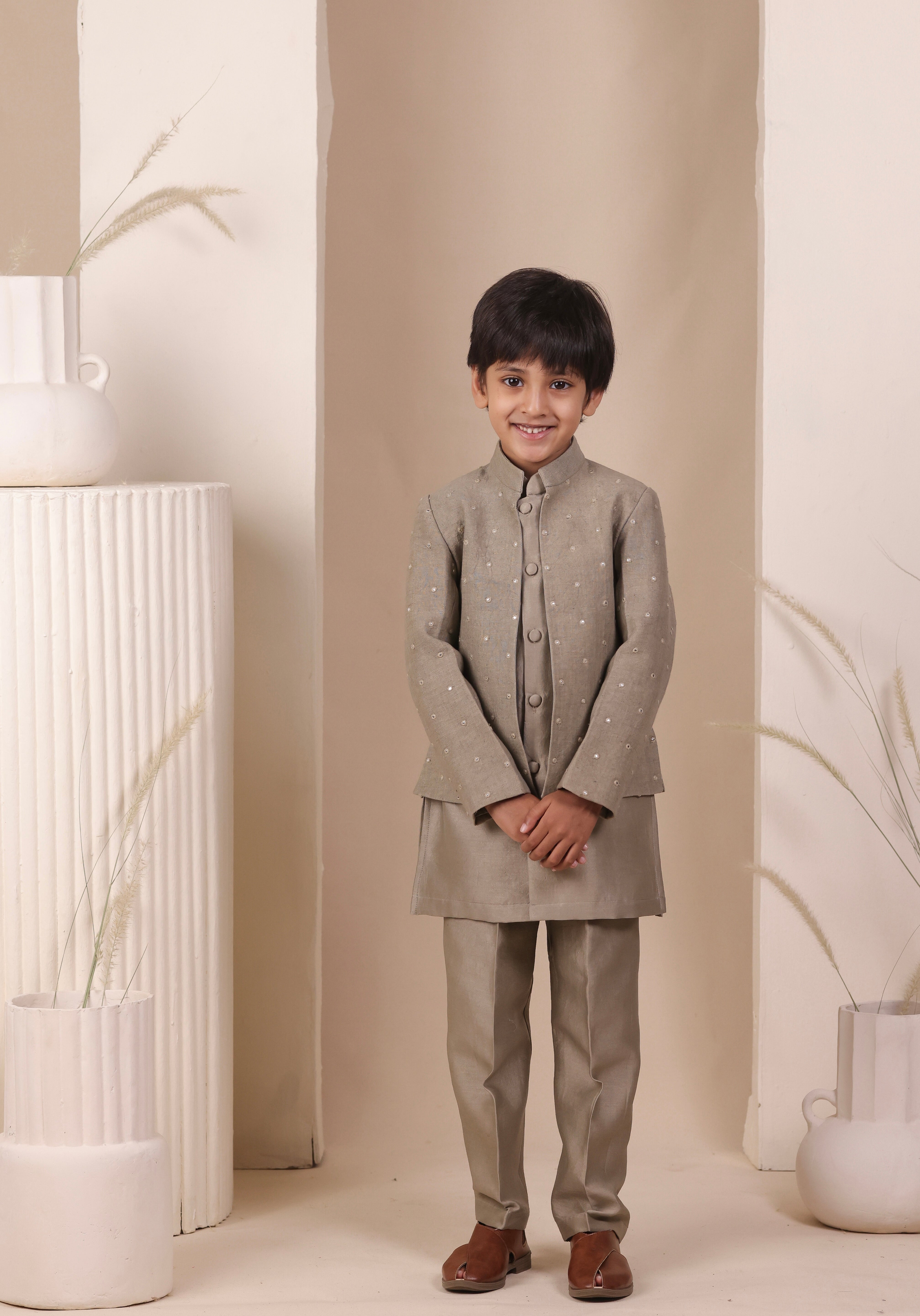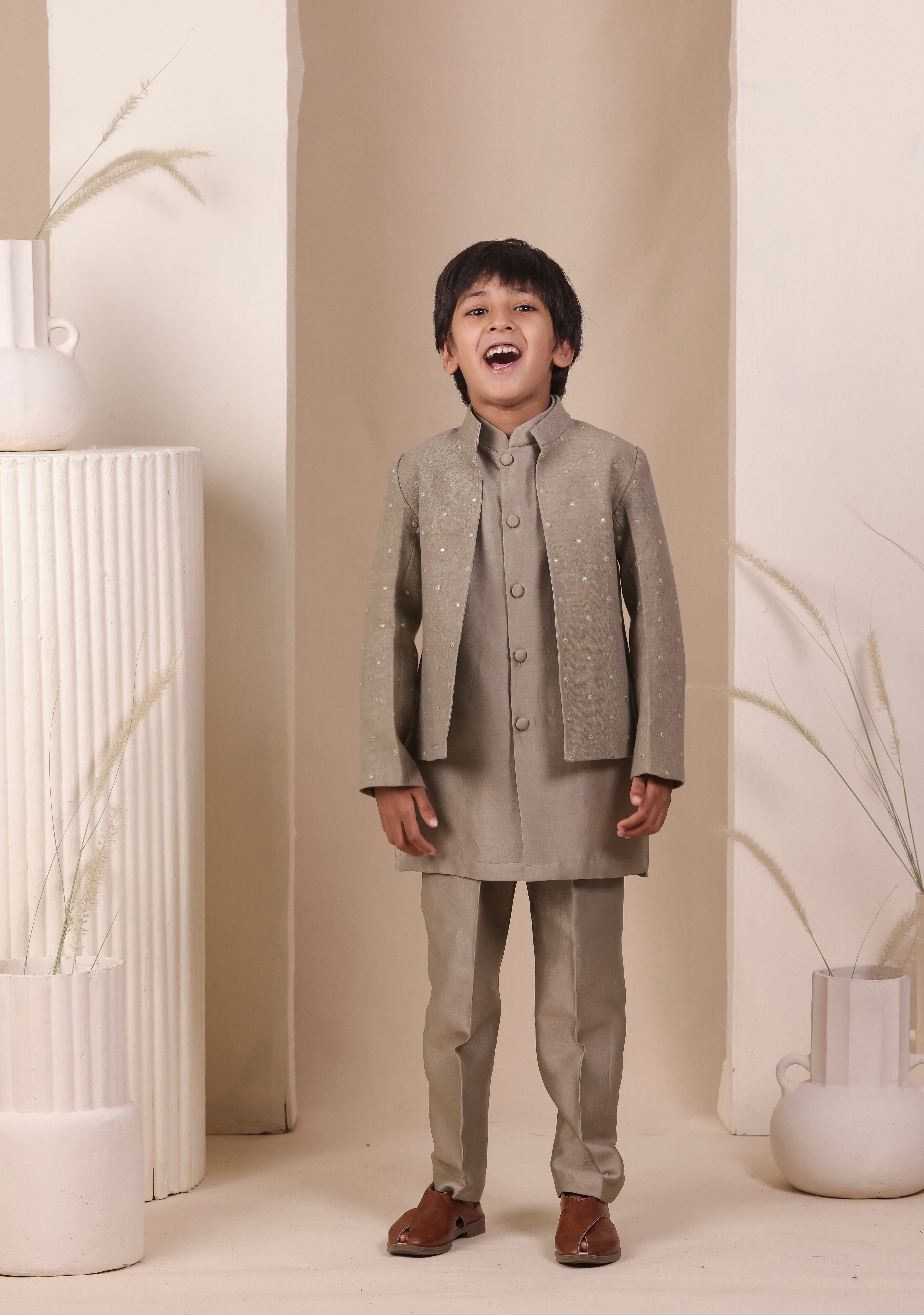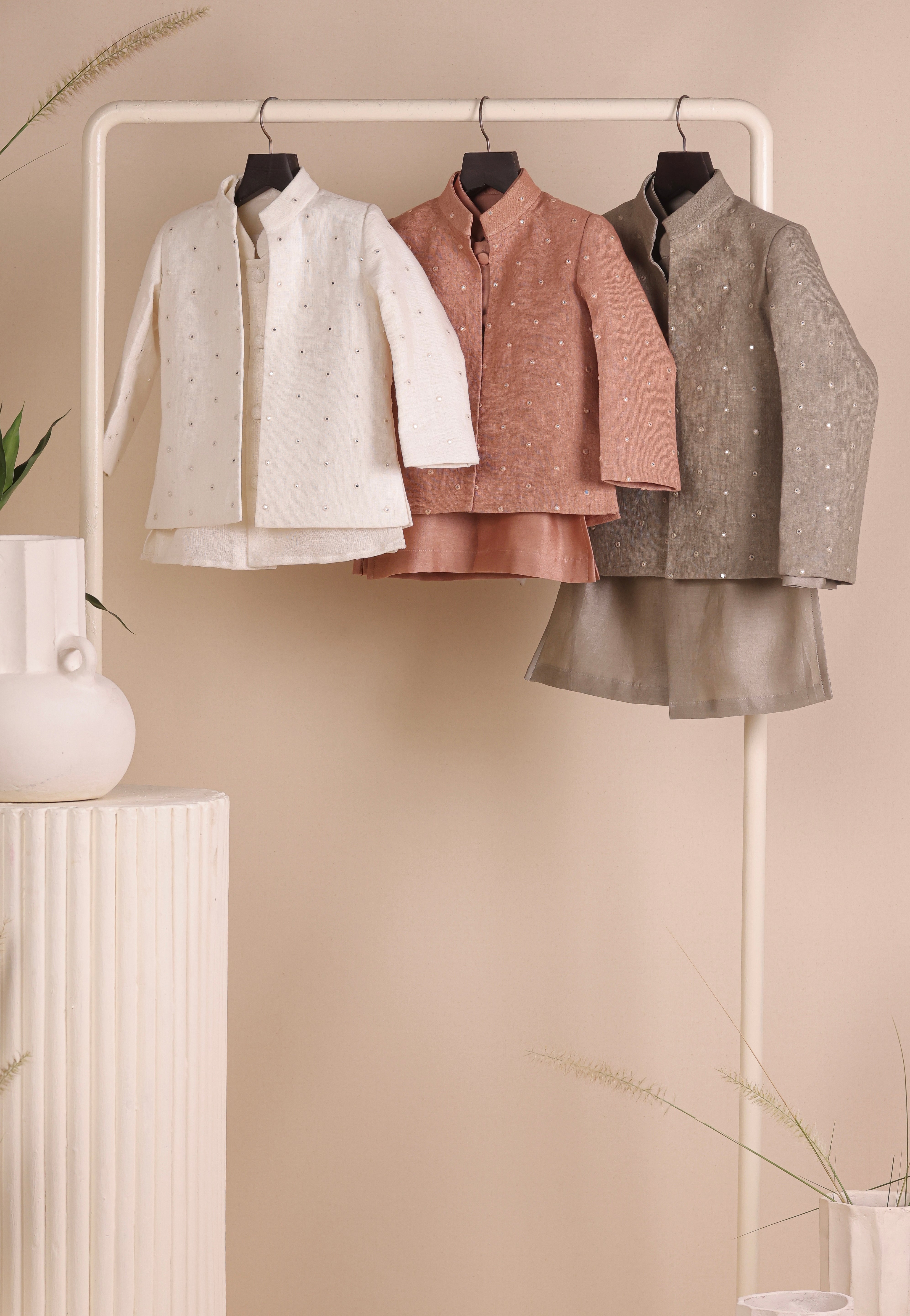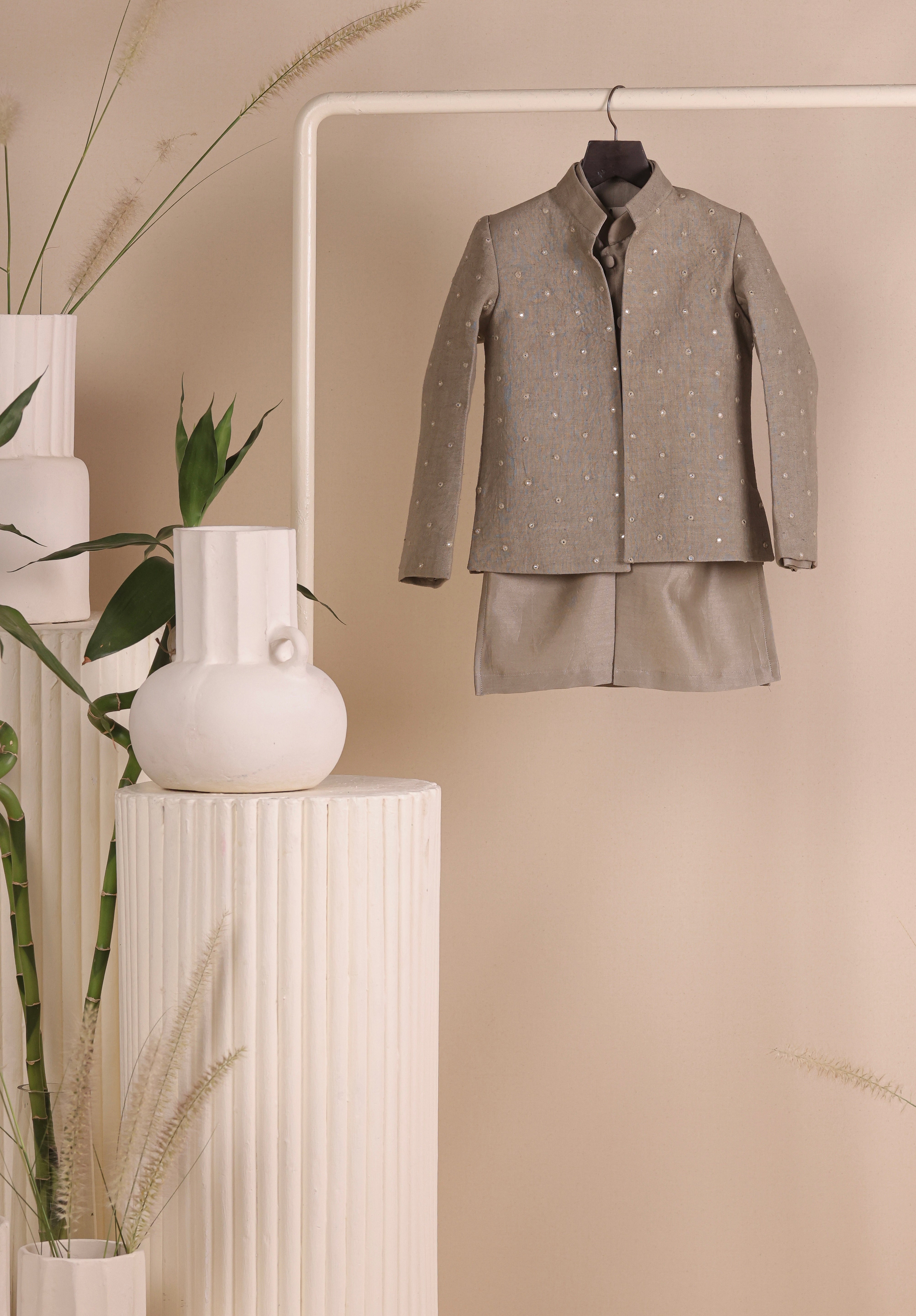 Crafted in breezy linen, this open Jodhpuri set is highlighted with subtle mirror embellishments. Paired with matching short kurta and pajama, it's a versatile choice available in three refined tones.