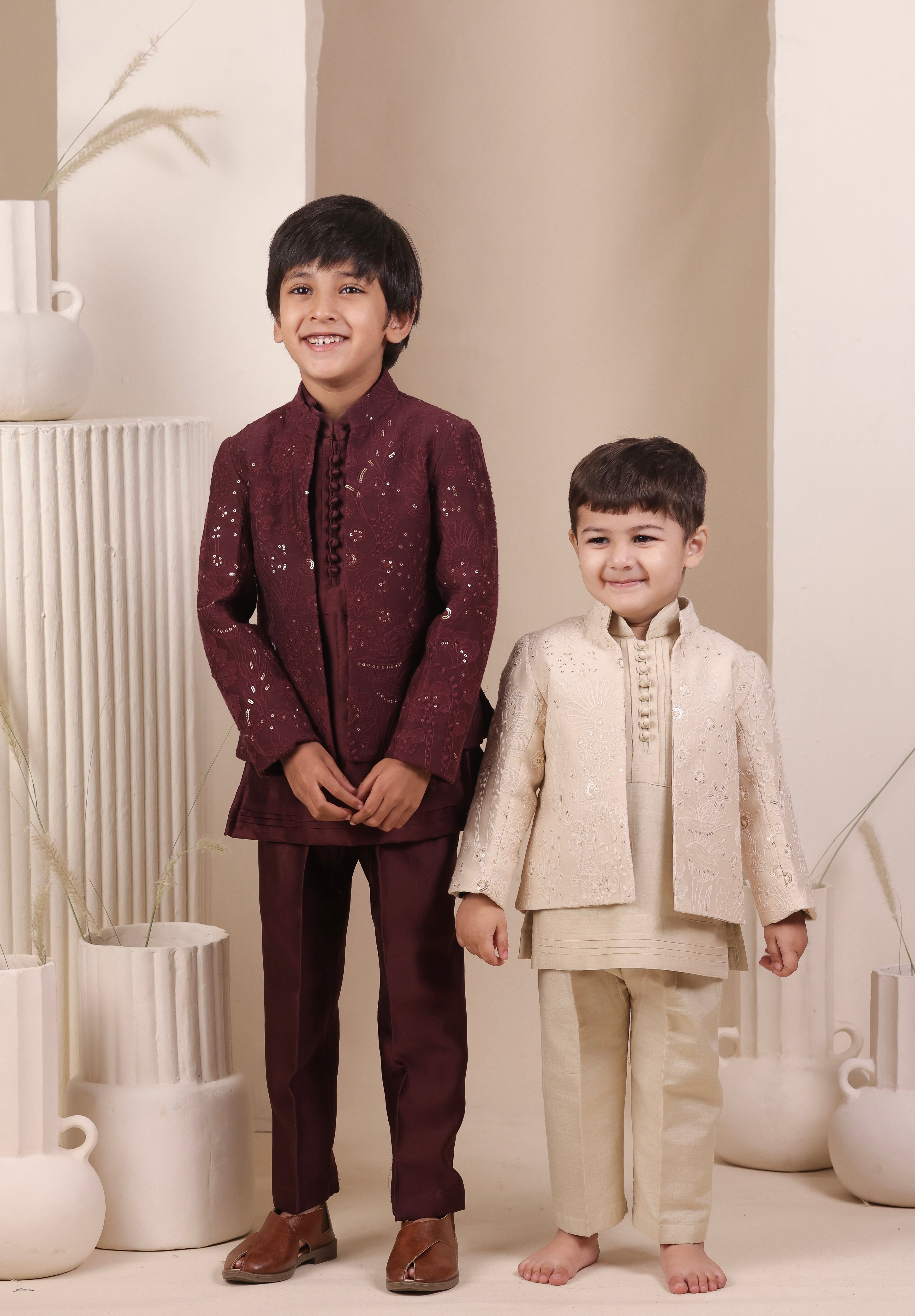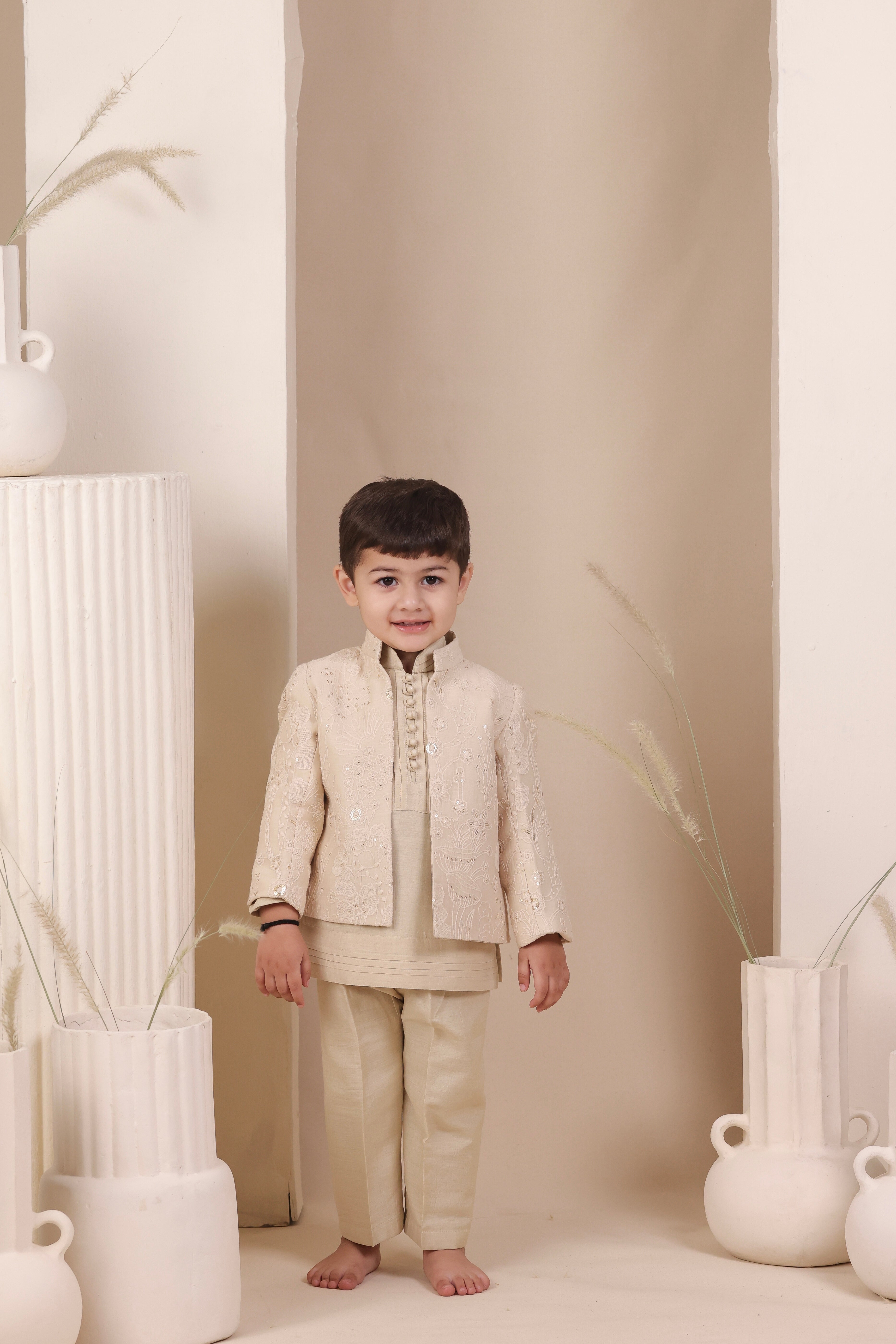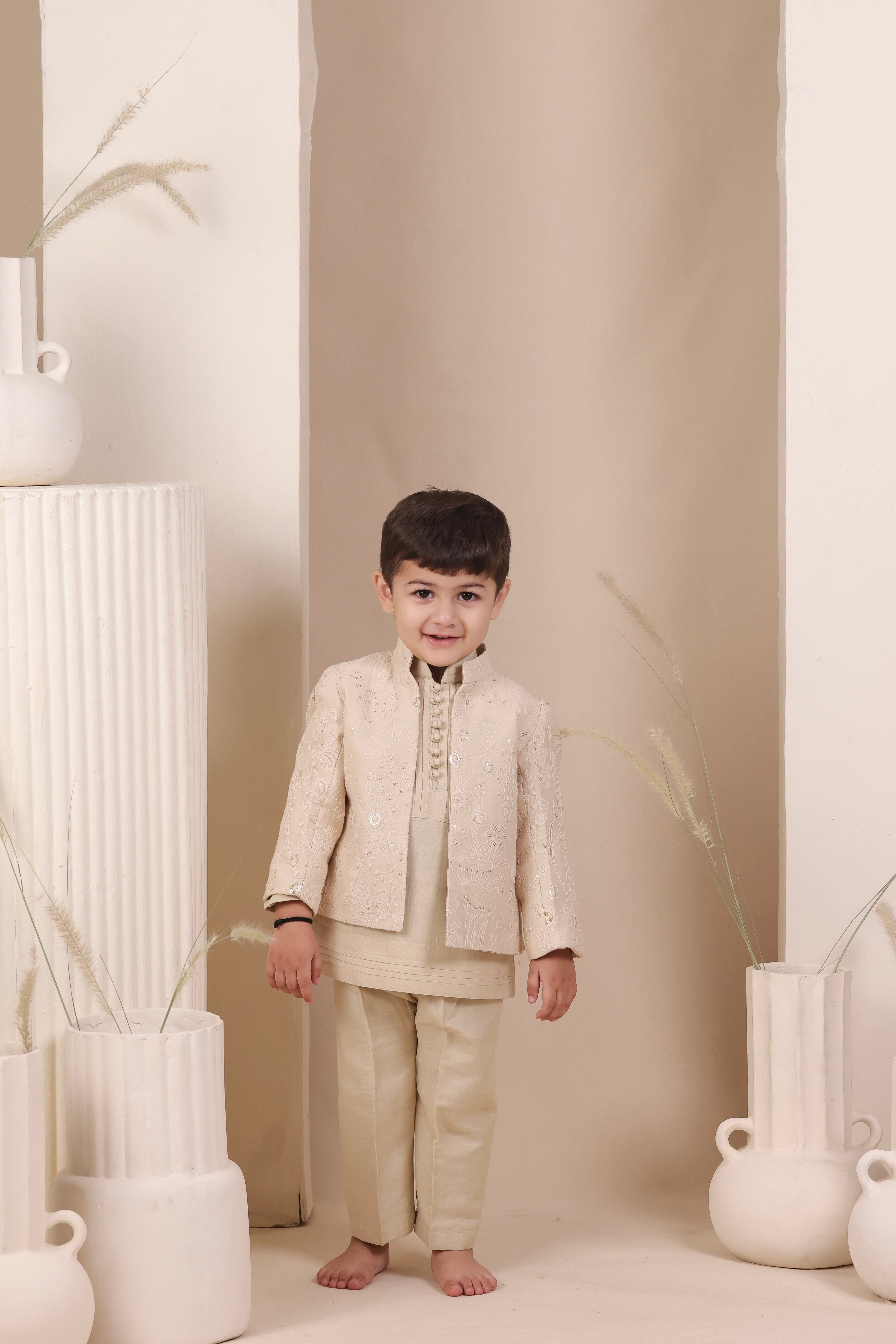 Tailored in elegant hues that transition effortlessly from day to evening, this embroidered Jodhpuri is paired with a matching kurta and pajama. The pleated accents on the kurta lend texture and subtle drama to the silhouette.