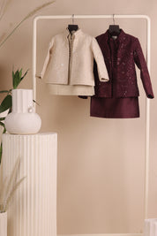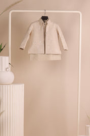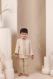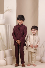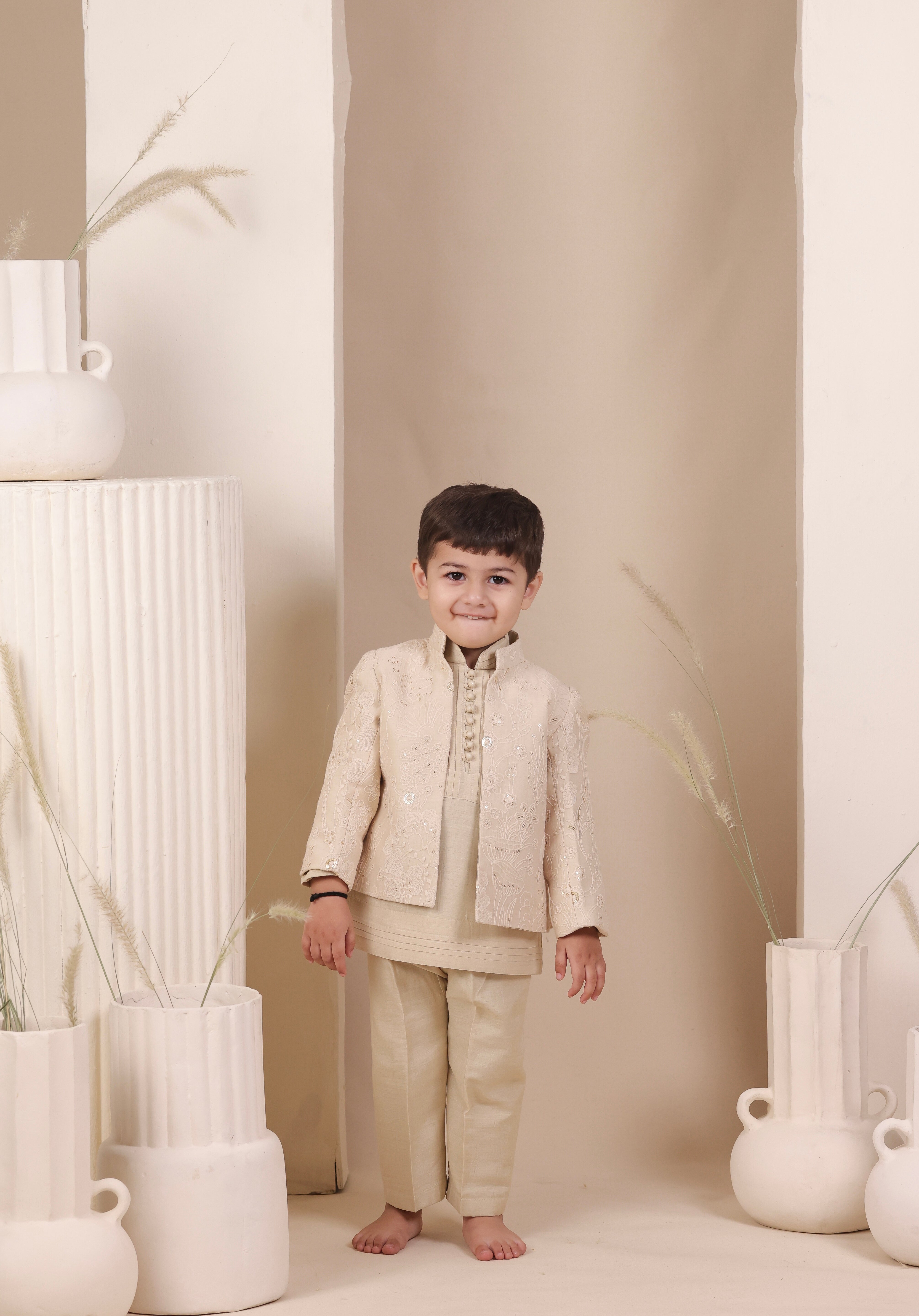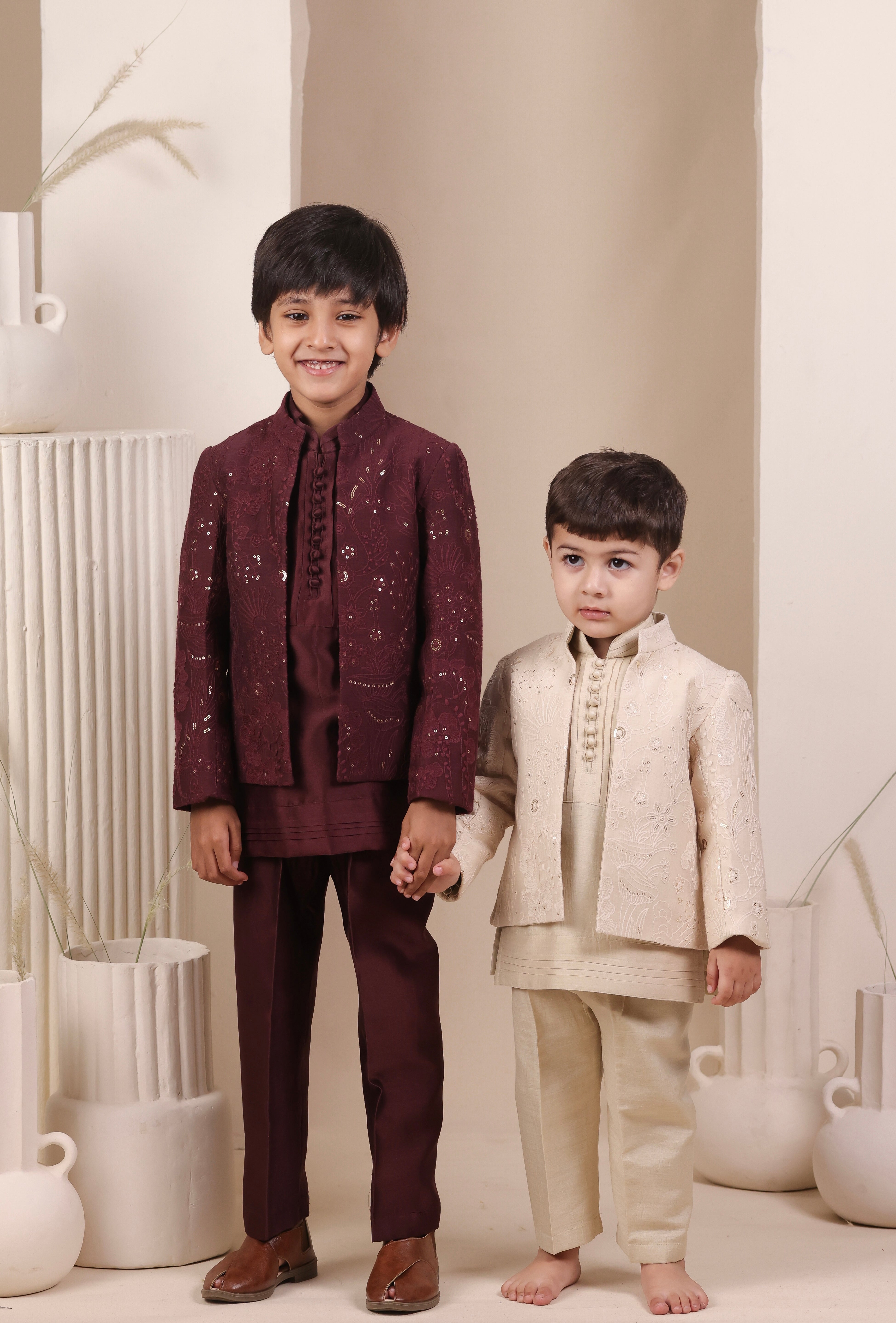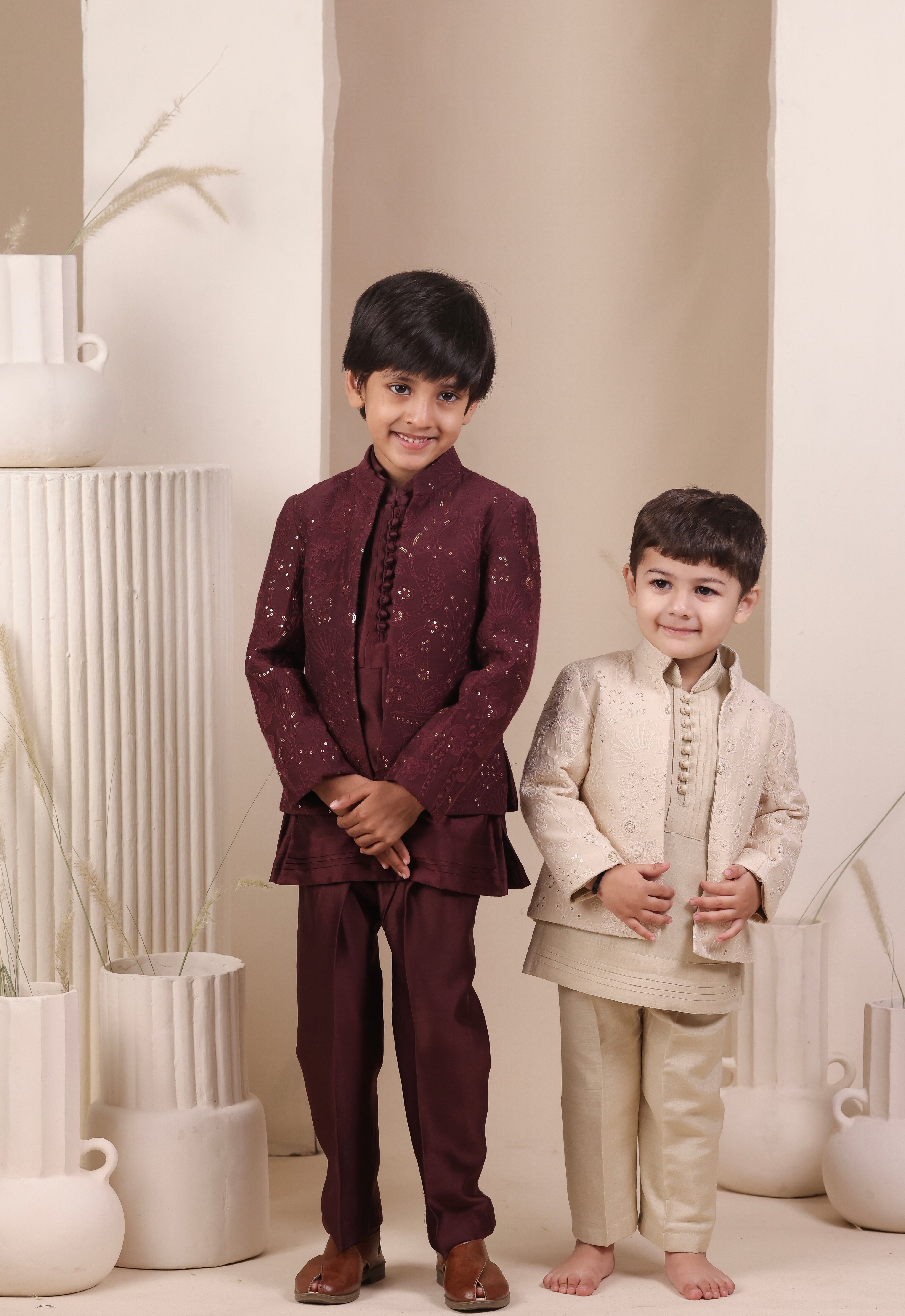 Tailored in elegant hues that transition effortlessly from day to evening, this embroidered Jodhpuri is paired with a matching kurta and pajama. The pleated accents on the kurta lend texture and subtle drama to the silhouette.