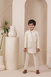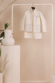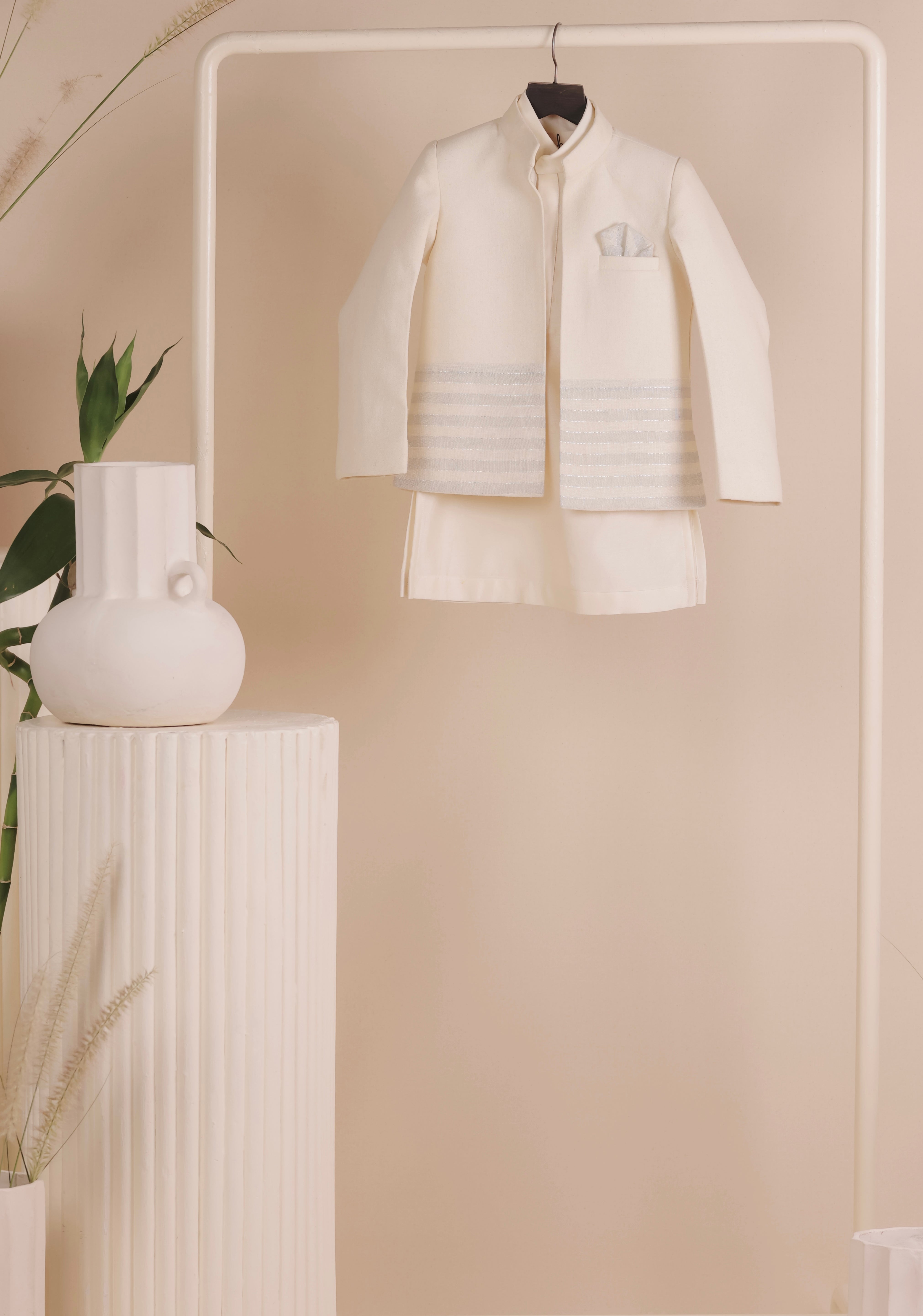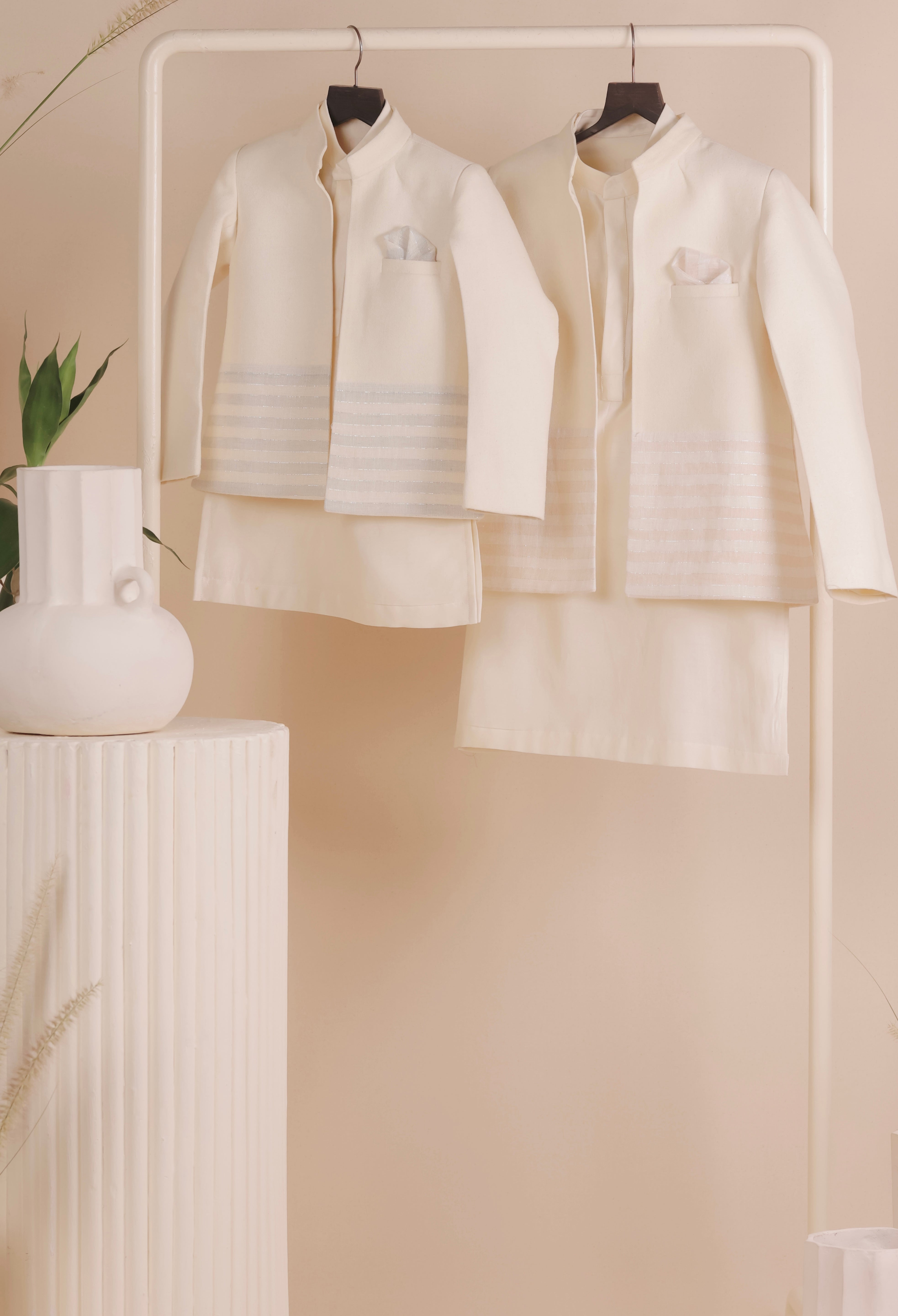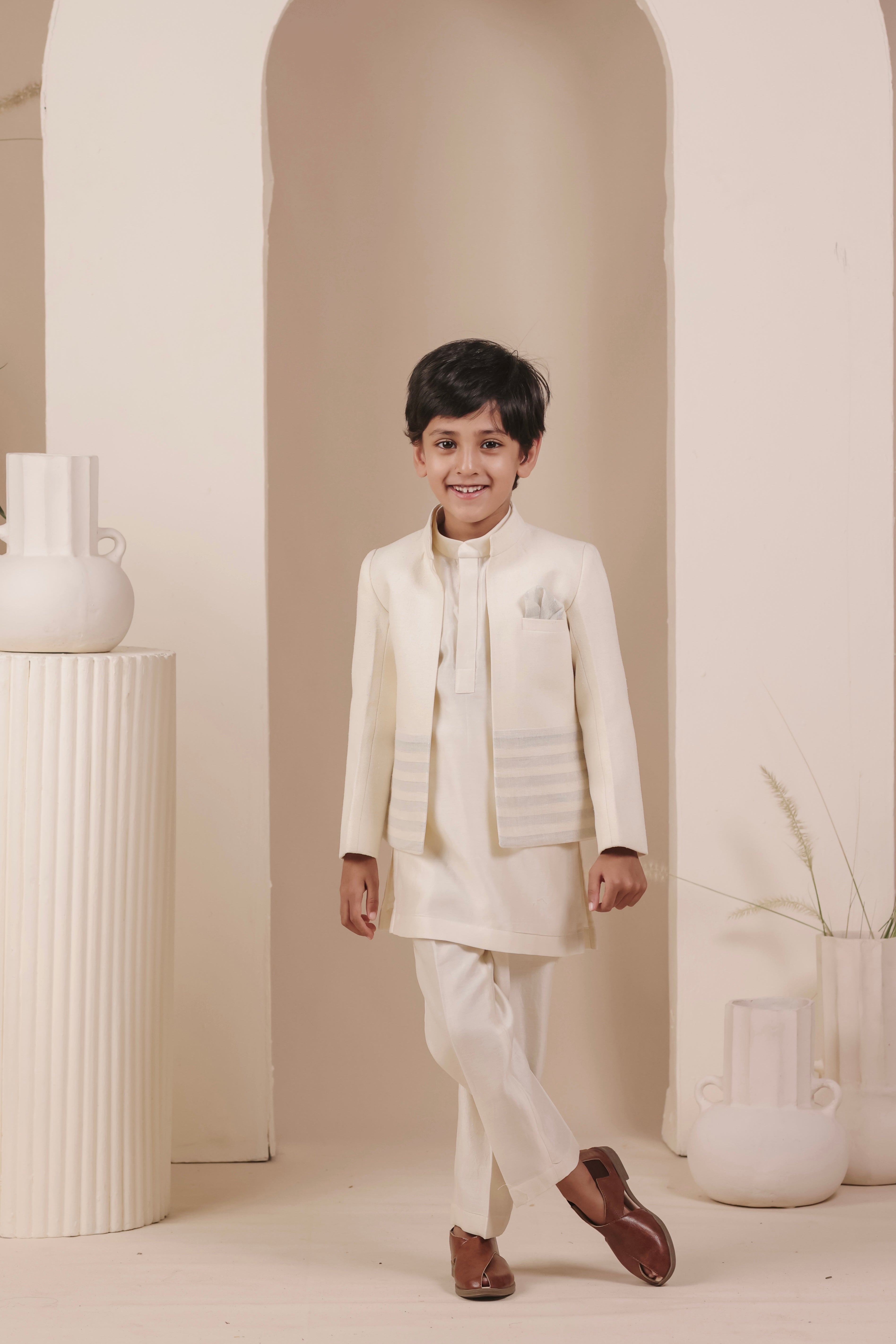 This Jodhpuri jacket stands out with a striped linen insert at the base and a perfectly matched pocket square. Completed with a coordinated short kurta and pajama, it’s a crisp, well-balanced look for festive days.