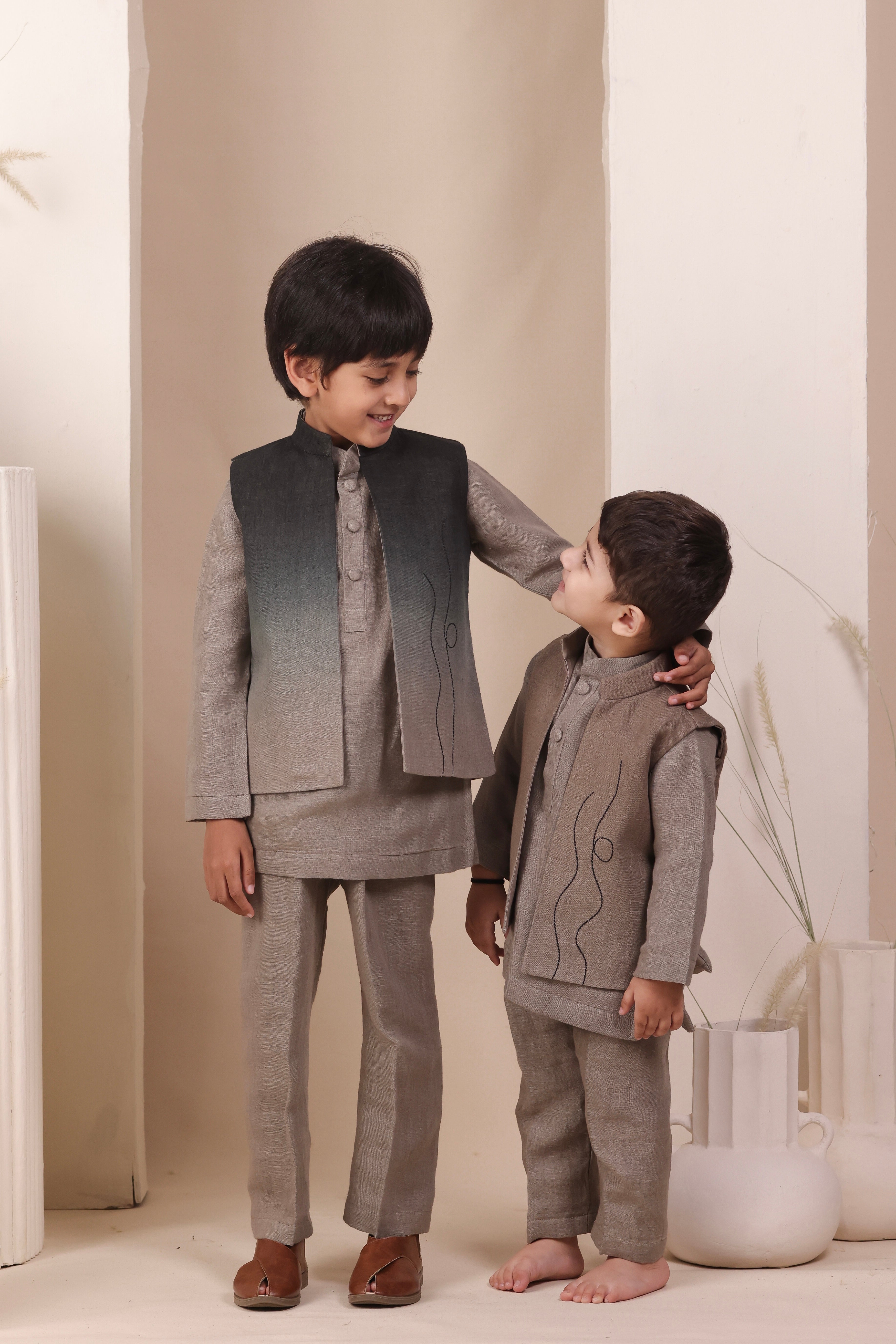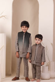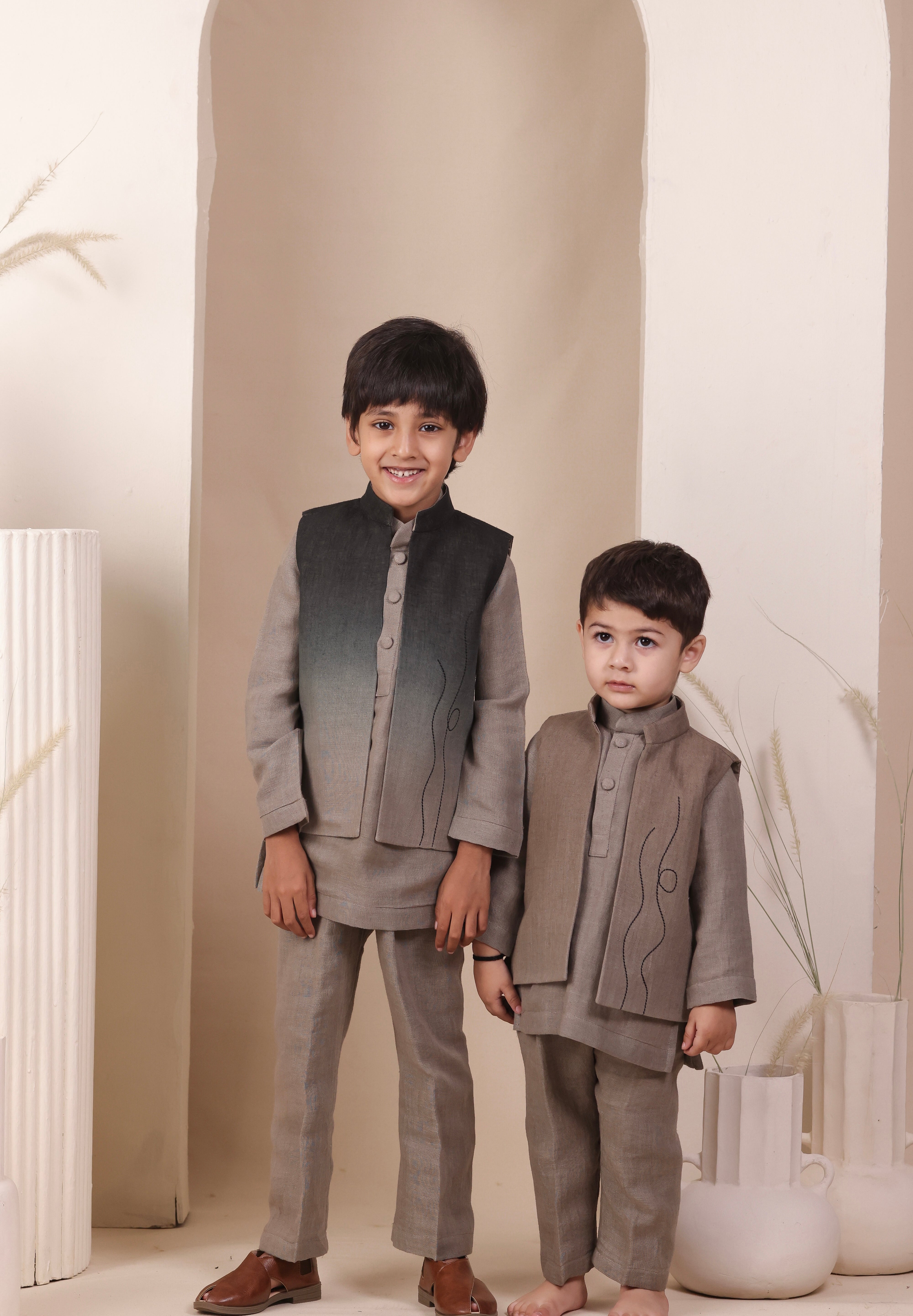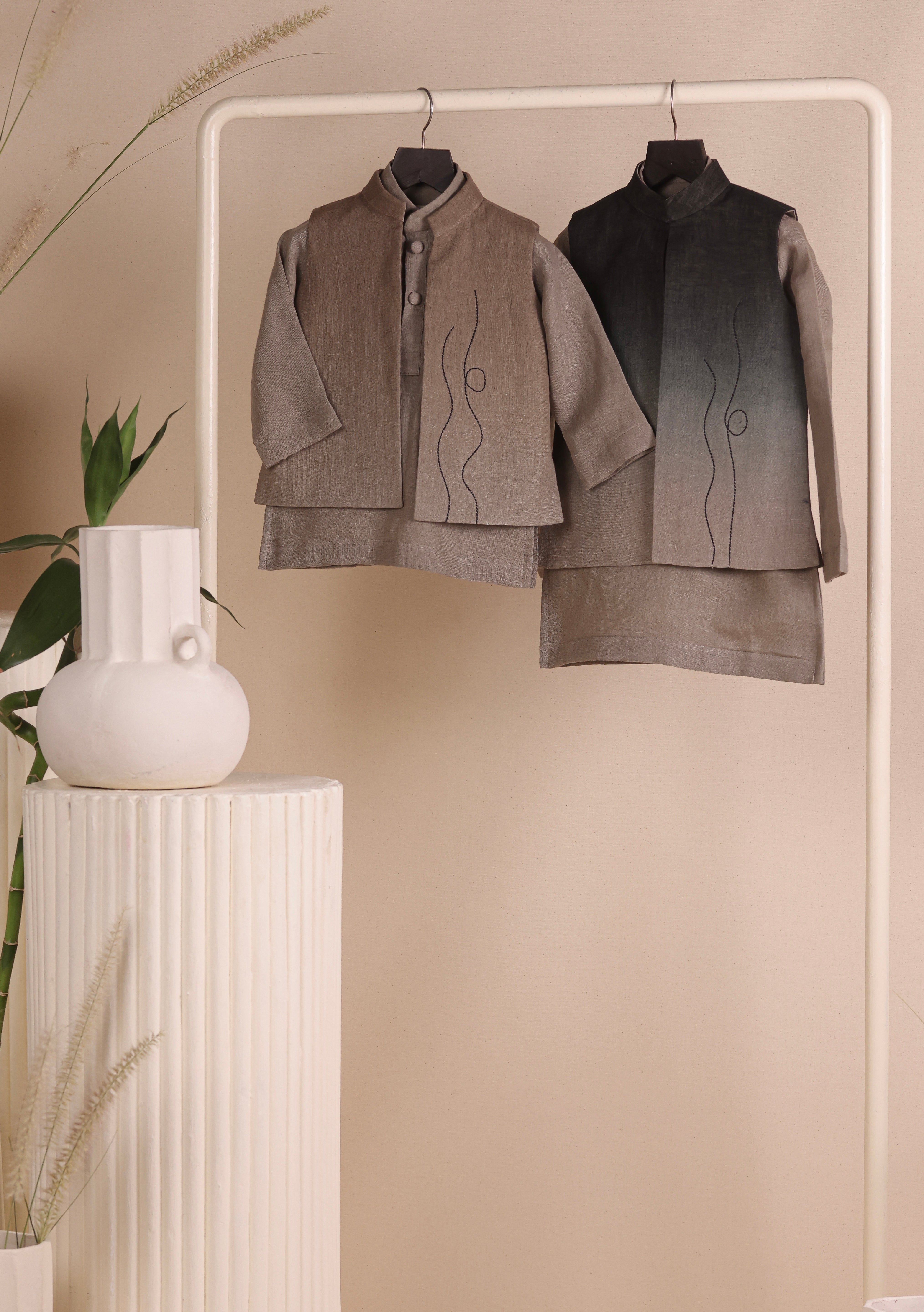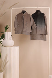 Crafted in soft linen, this set features a short kurta and matching pajama in earthy tones. The highlight is the ombré jacket adorned with subtle embroidery details, adding texture and charm. A versatile outfit that’s equal parts style and ease.