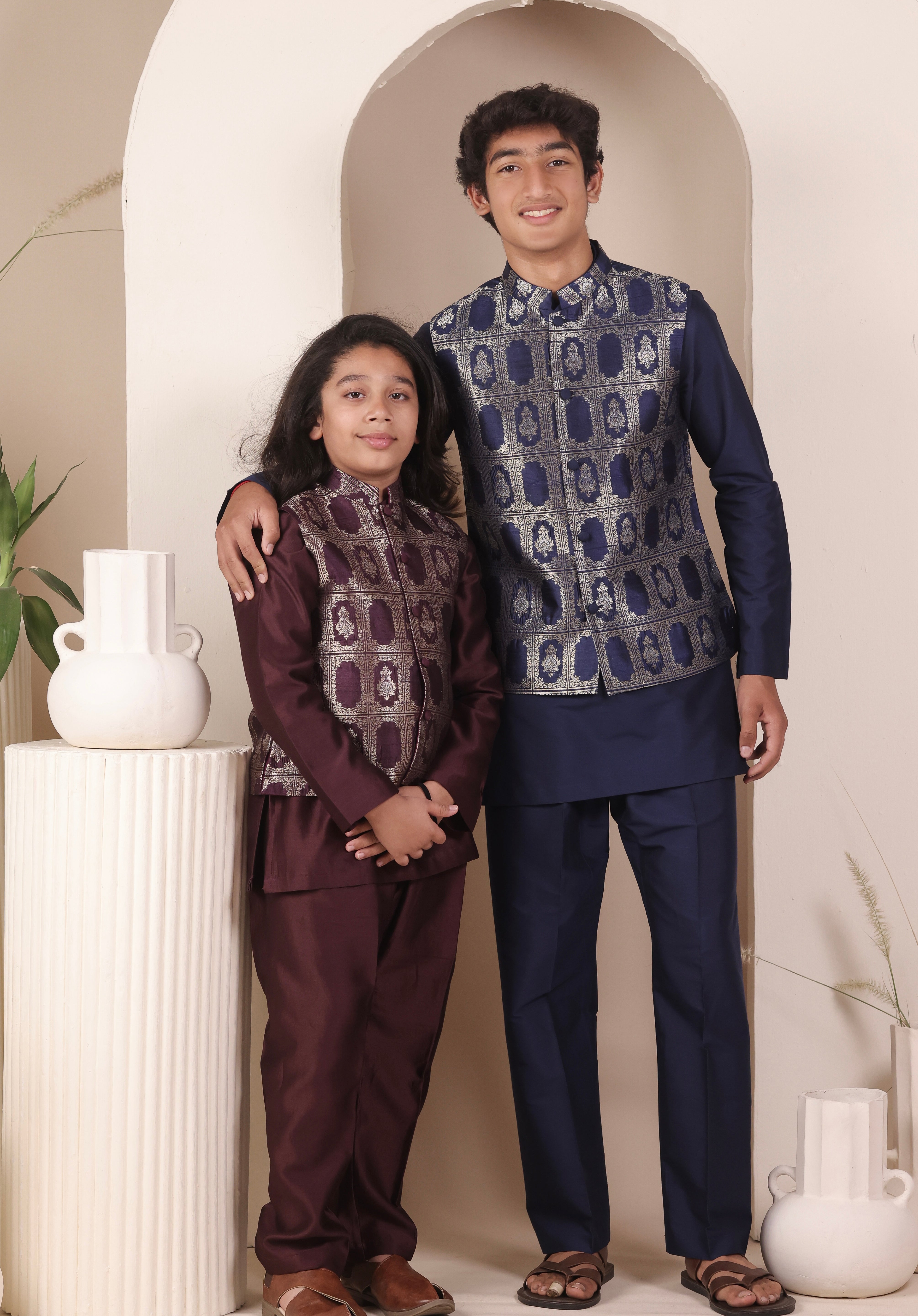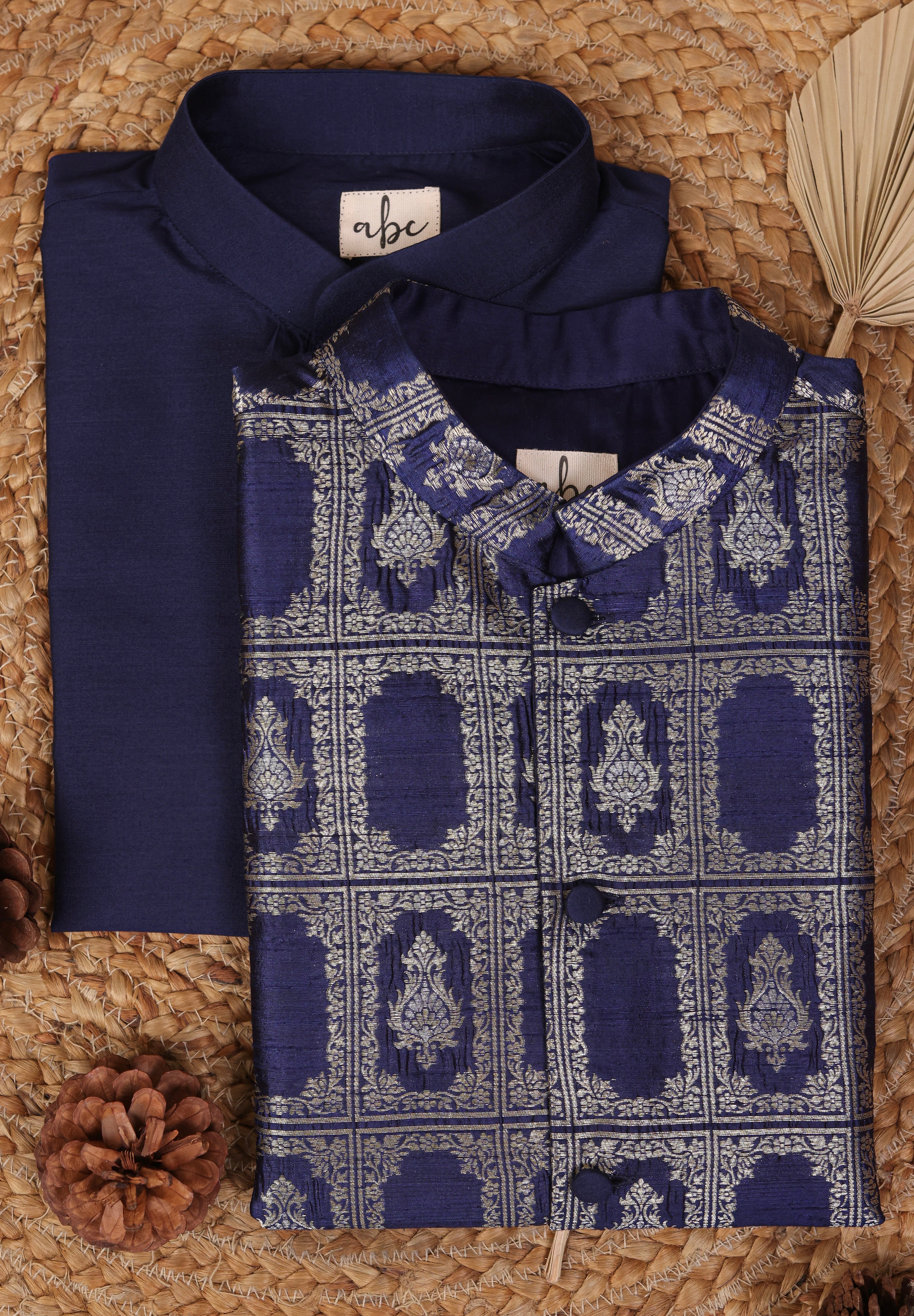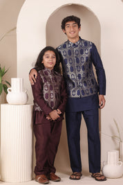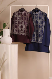 This set features a classic kurta and pajama paired with a handloom Tussar Nehru jacket. The rich tones and natural texture of the jacket lend depth and quiet elegance — ideal for evening gatherings.
