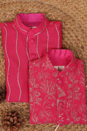 Featuring intricate zari accents on the kurta and jacket, this set pairs traditional craftsmanship with playful, vivid tones. Complete with a matching pajama for a cohesive look.