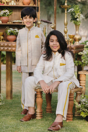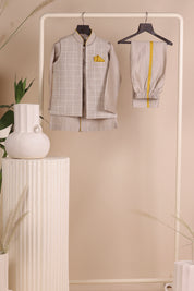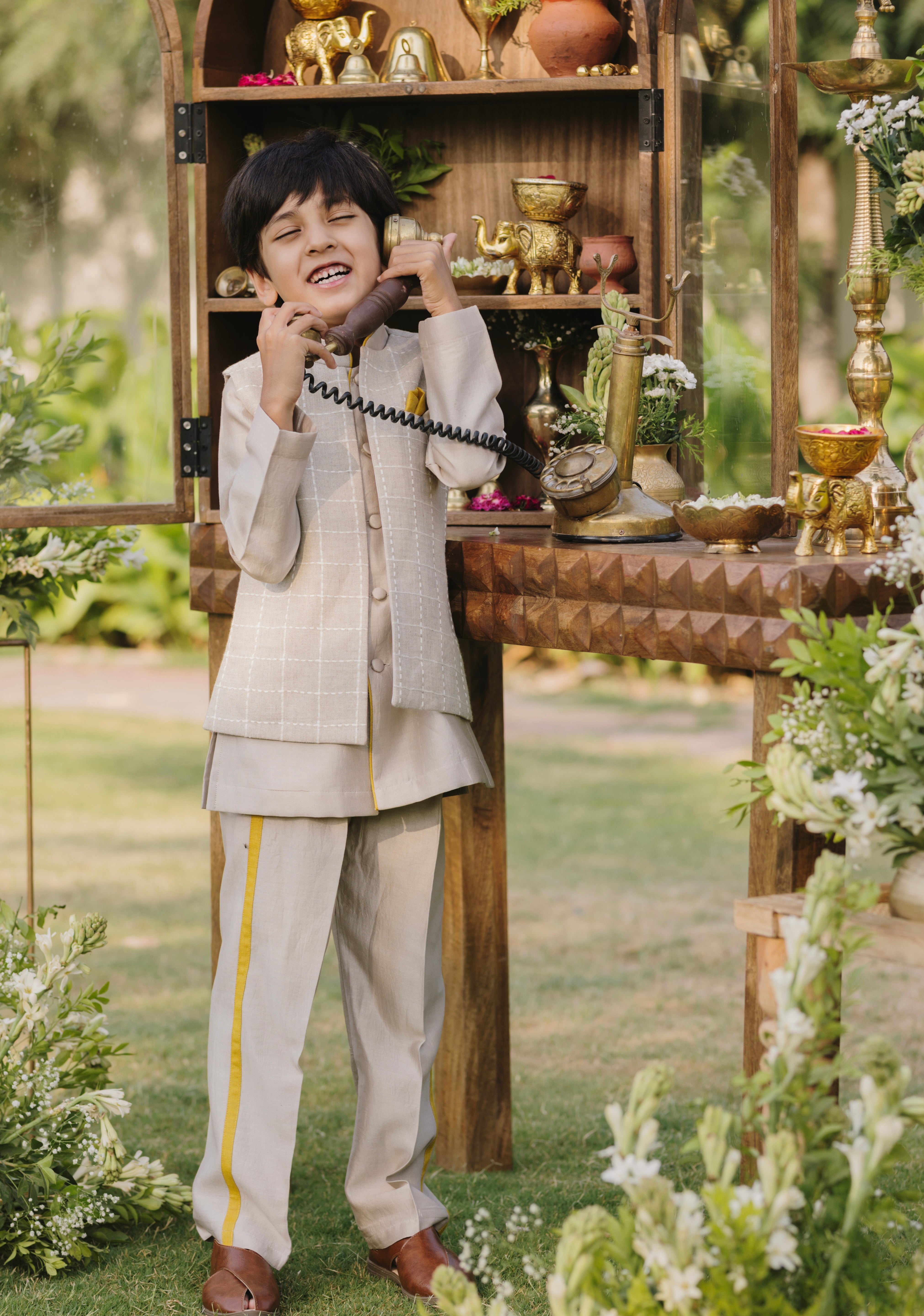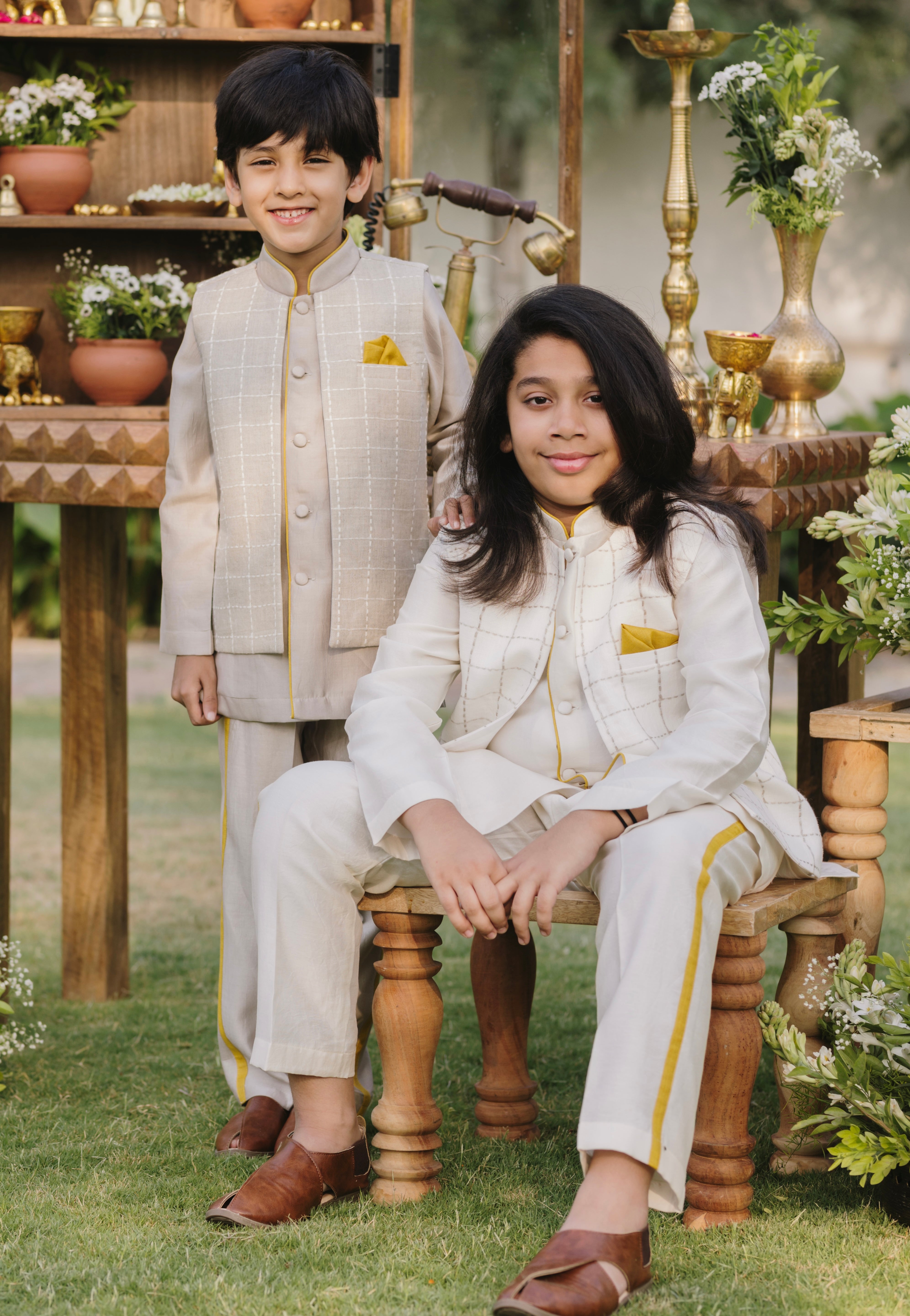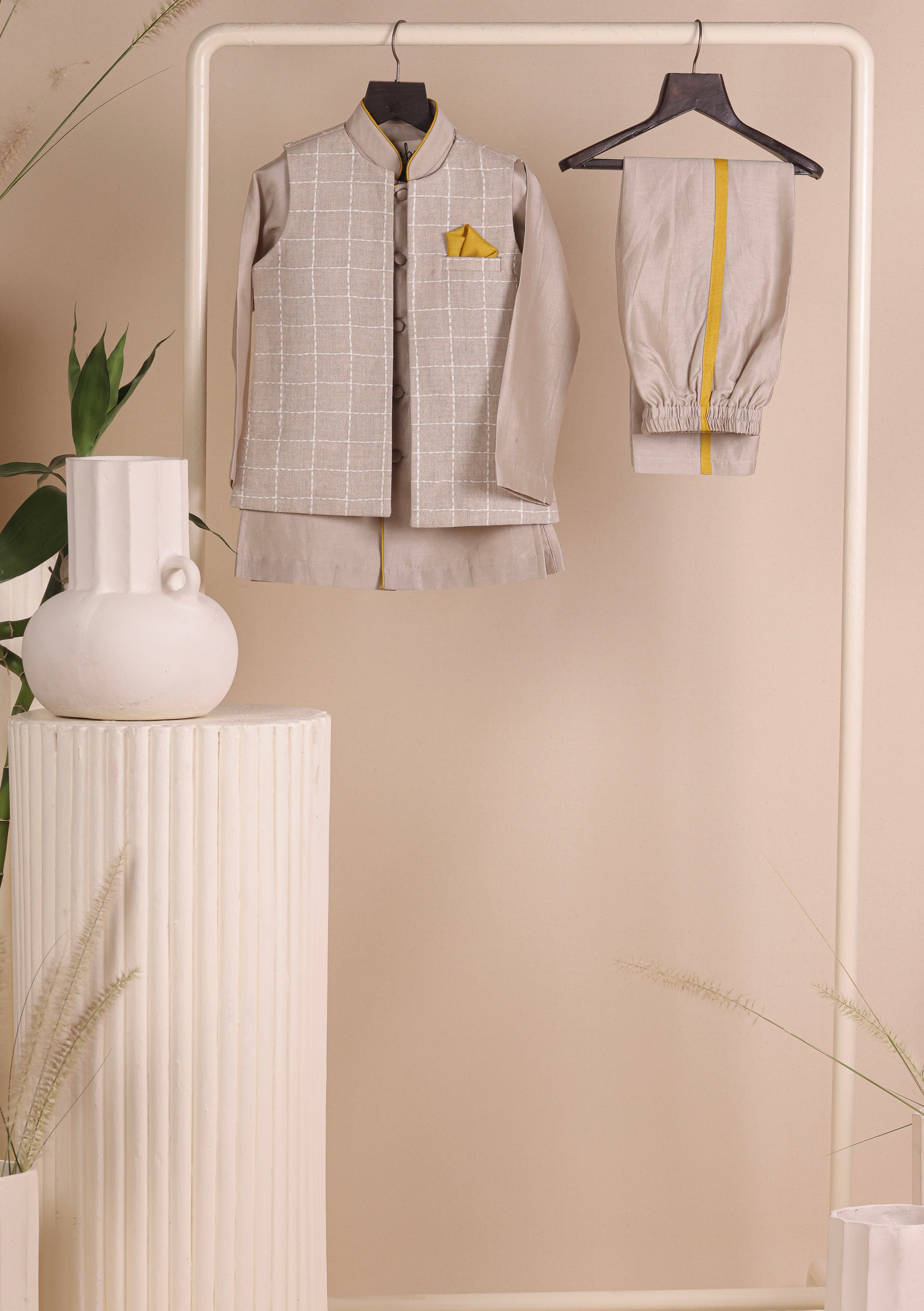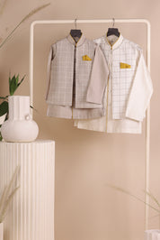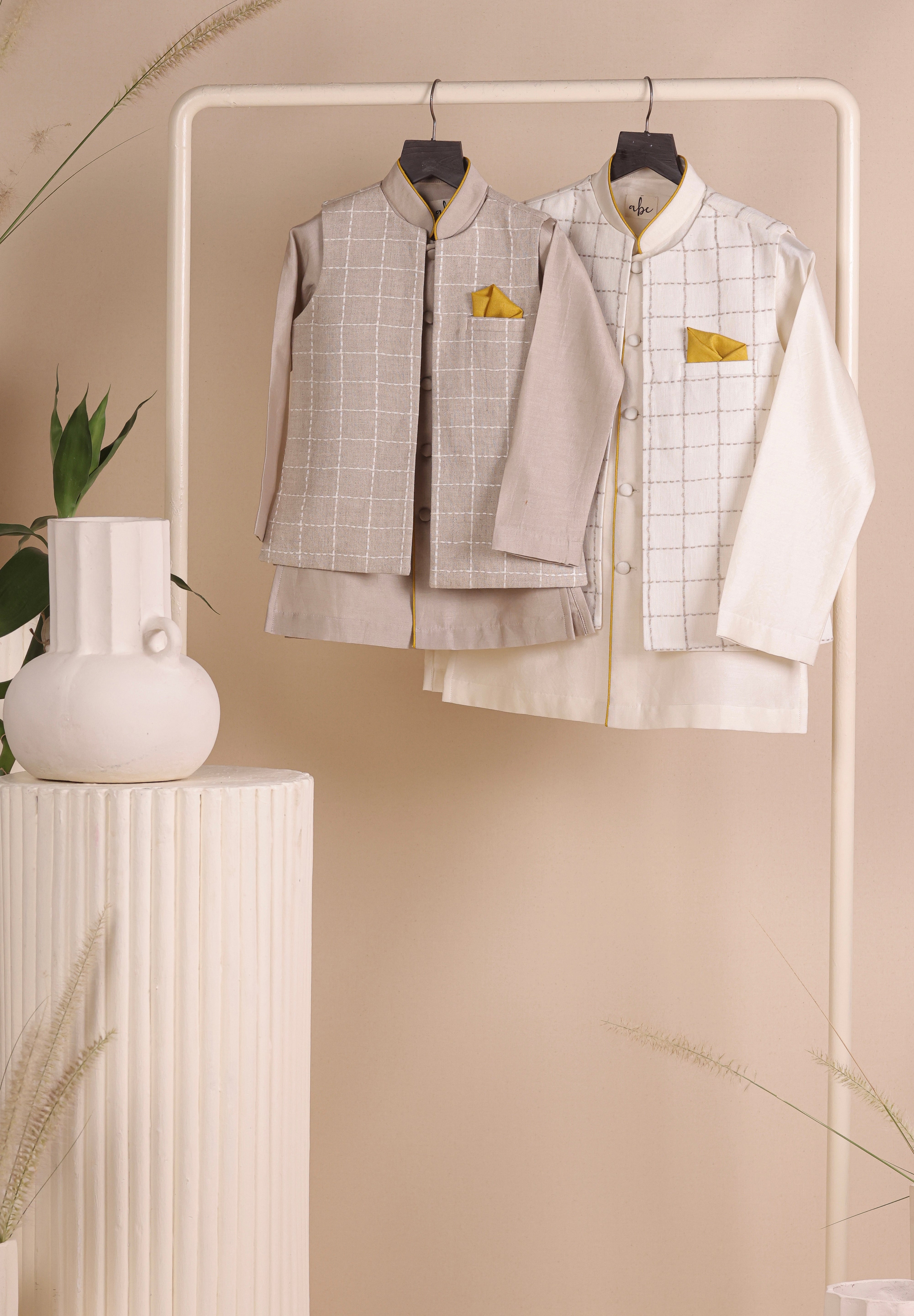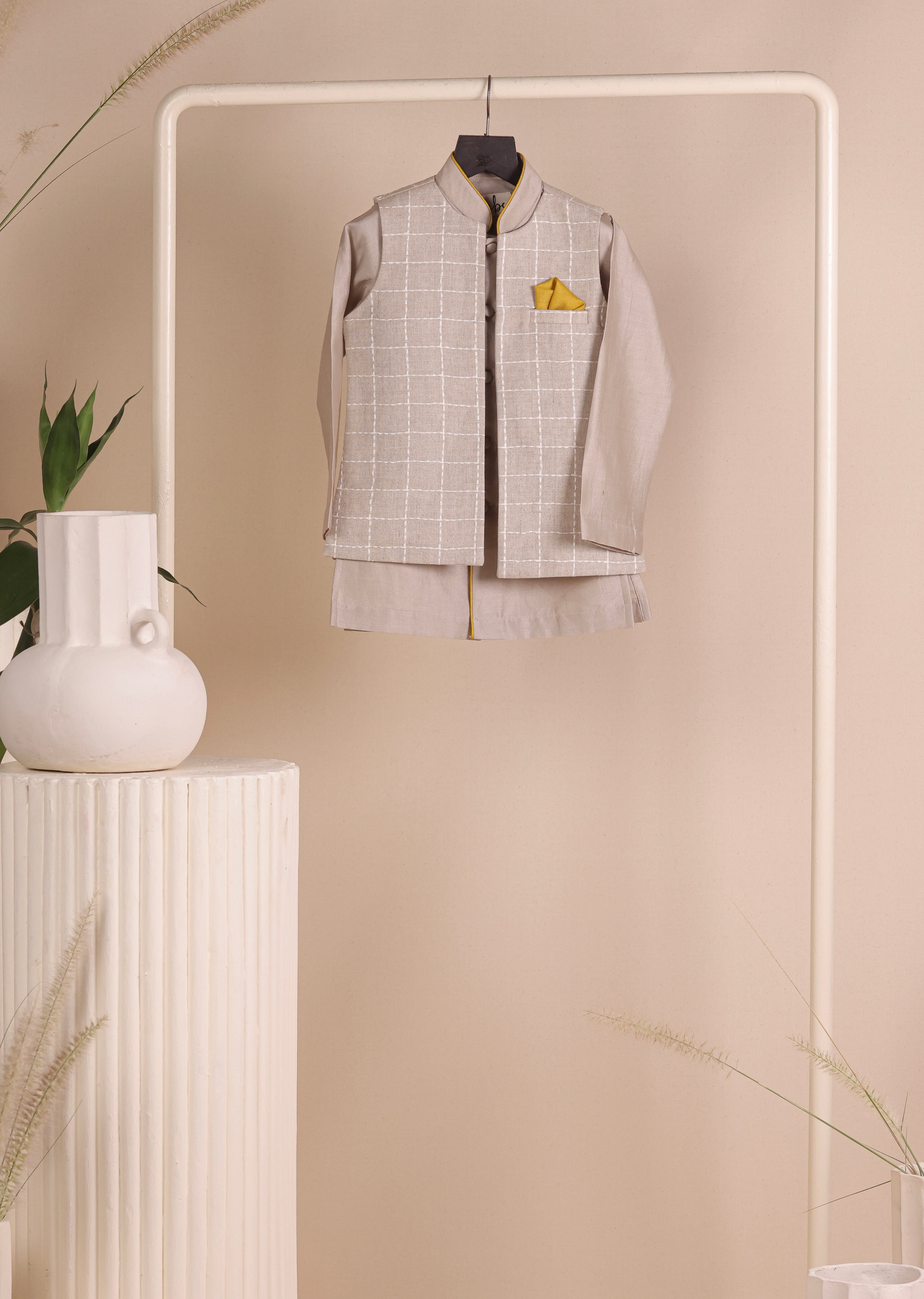 A crisp shirt-style kurta forms the base of this set, paired with a front-open linen jacket embroidered in a subtle checks pattern. Thoughtful contrast piping and a bold pocket square add just the right touch of colour to its neutral palette. Finished with a matching pajama, it’s a clean, contemporary look for festive dressing with character.