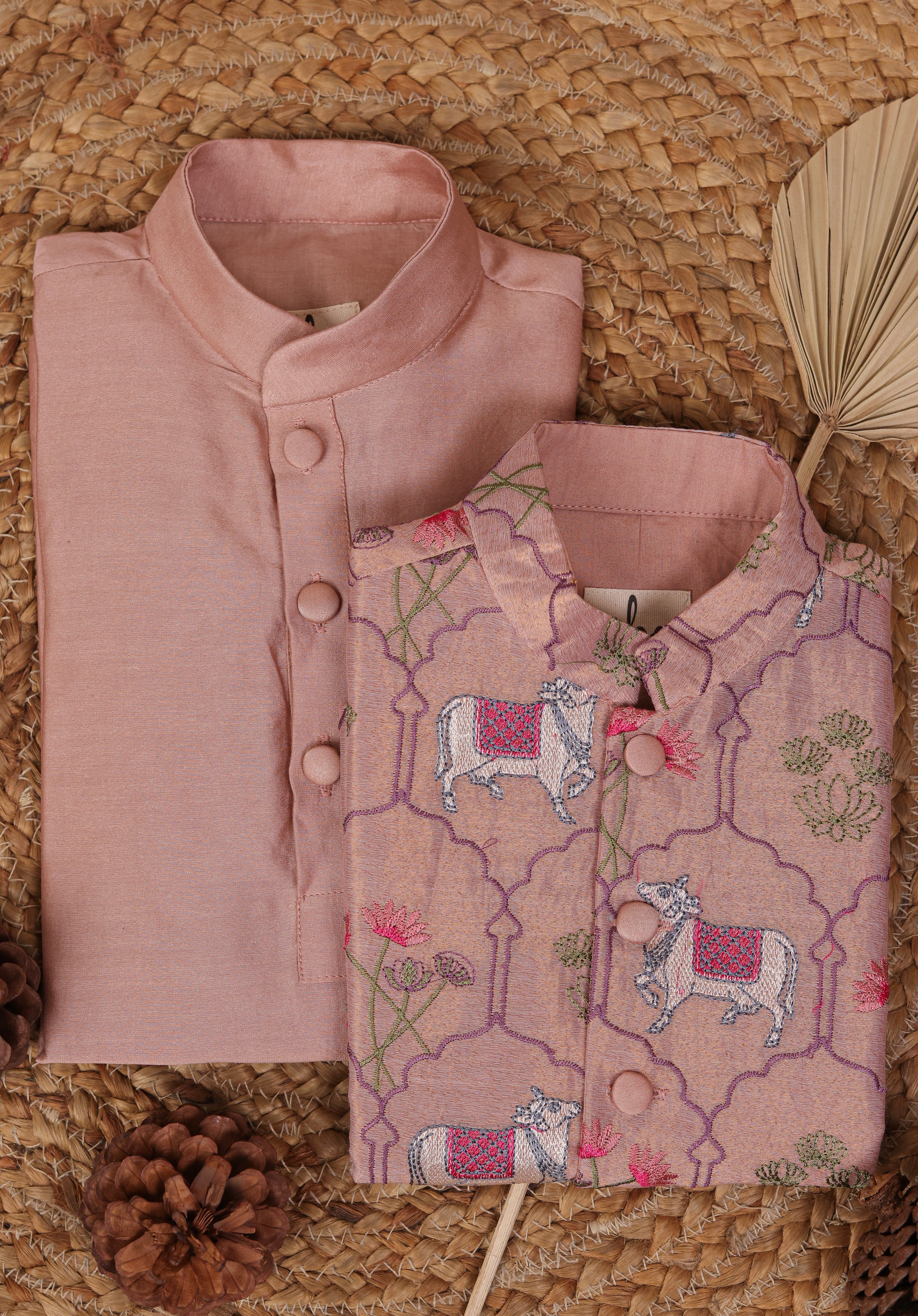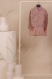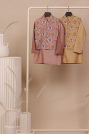 Available in soft, understated tones, this kurta pajama and Nehru jacket set is detailed with elegant thread embroidery. A graceful choice for intimate celebrations.