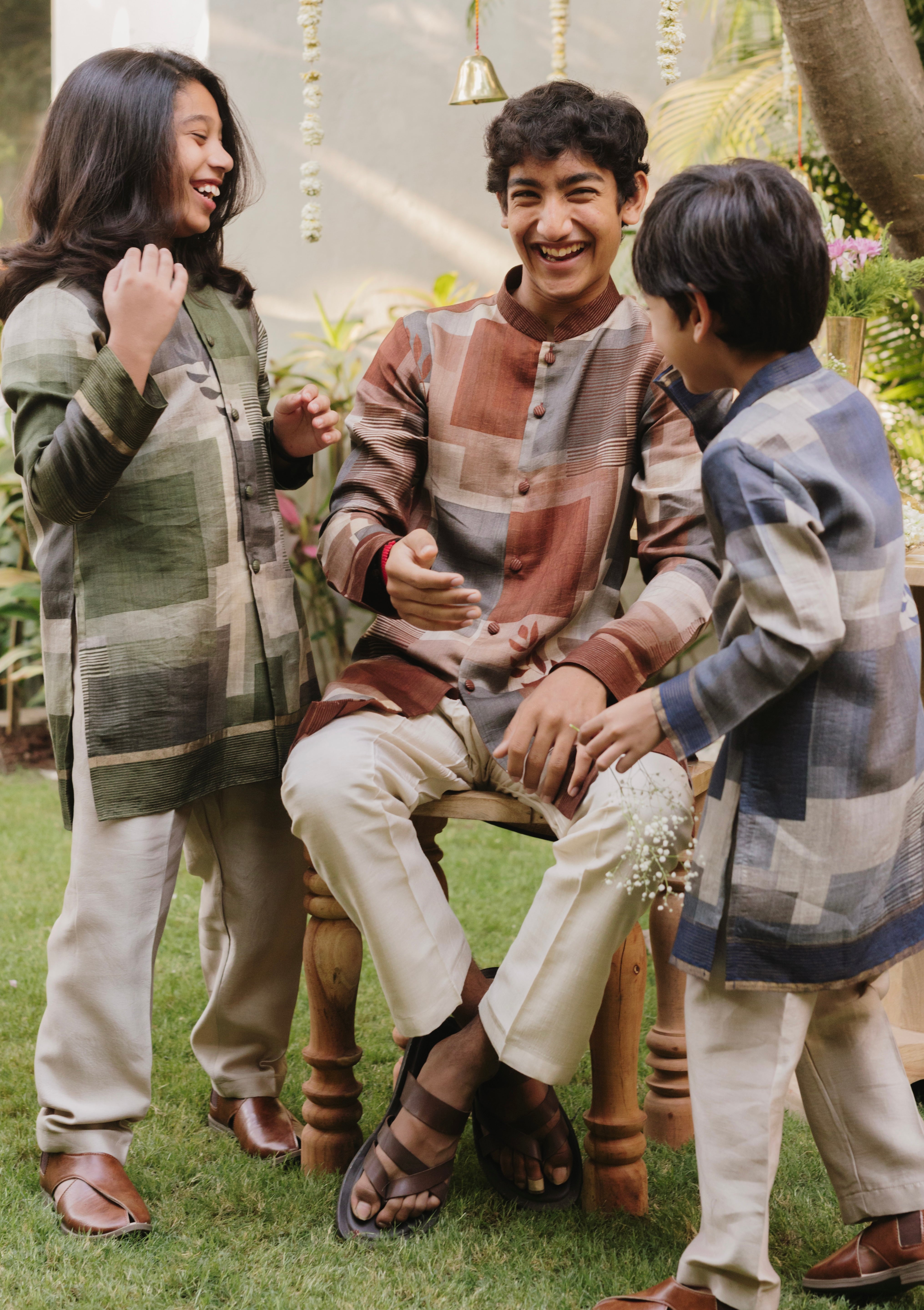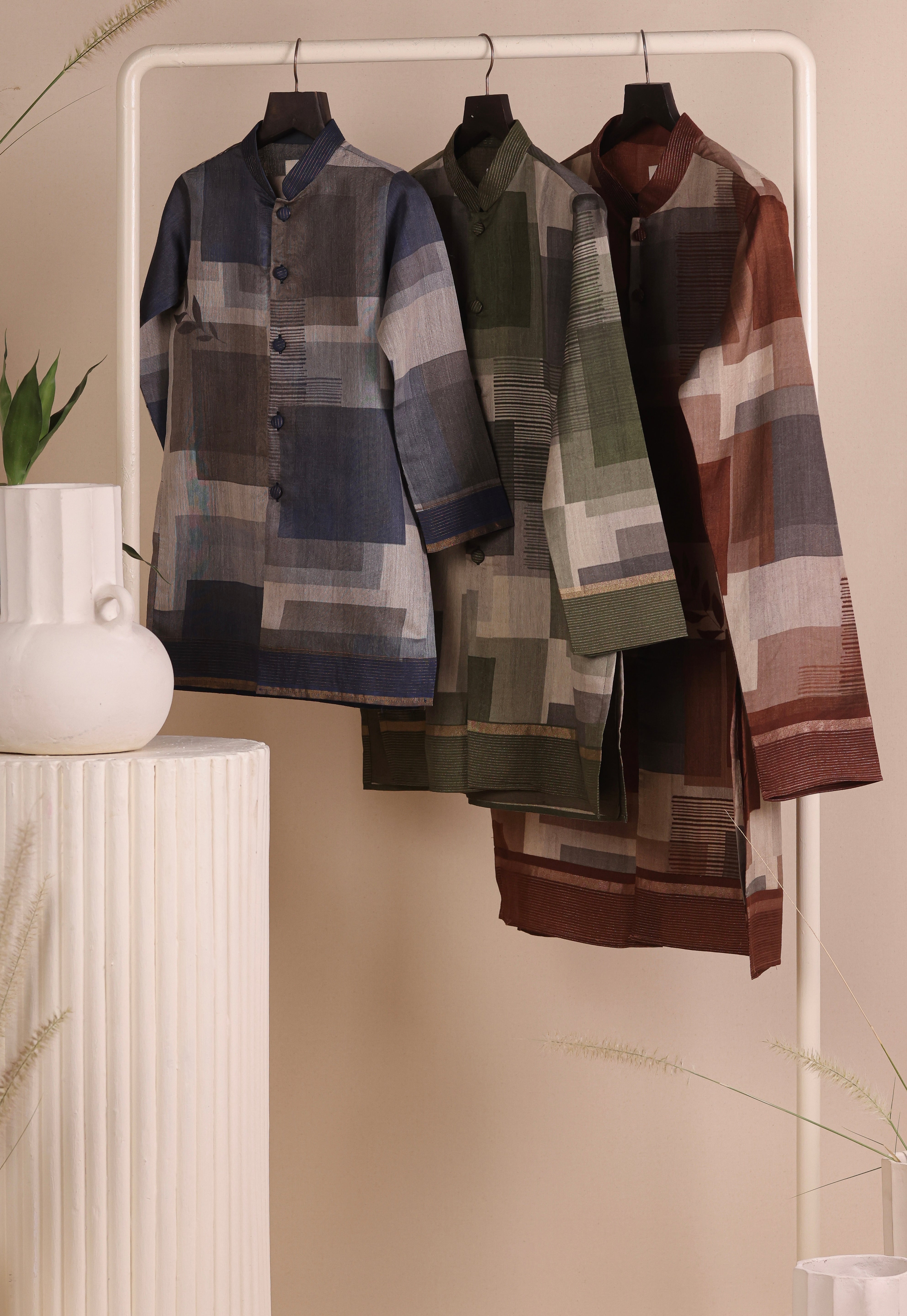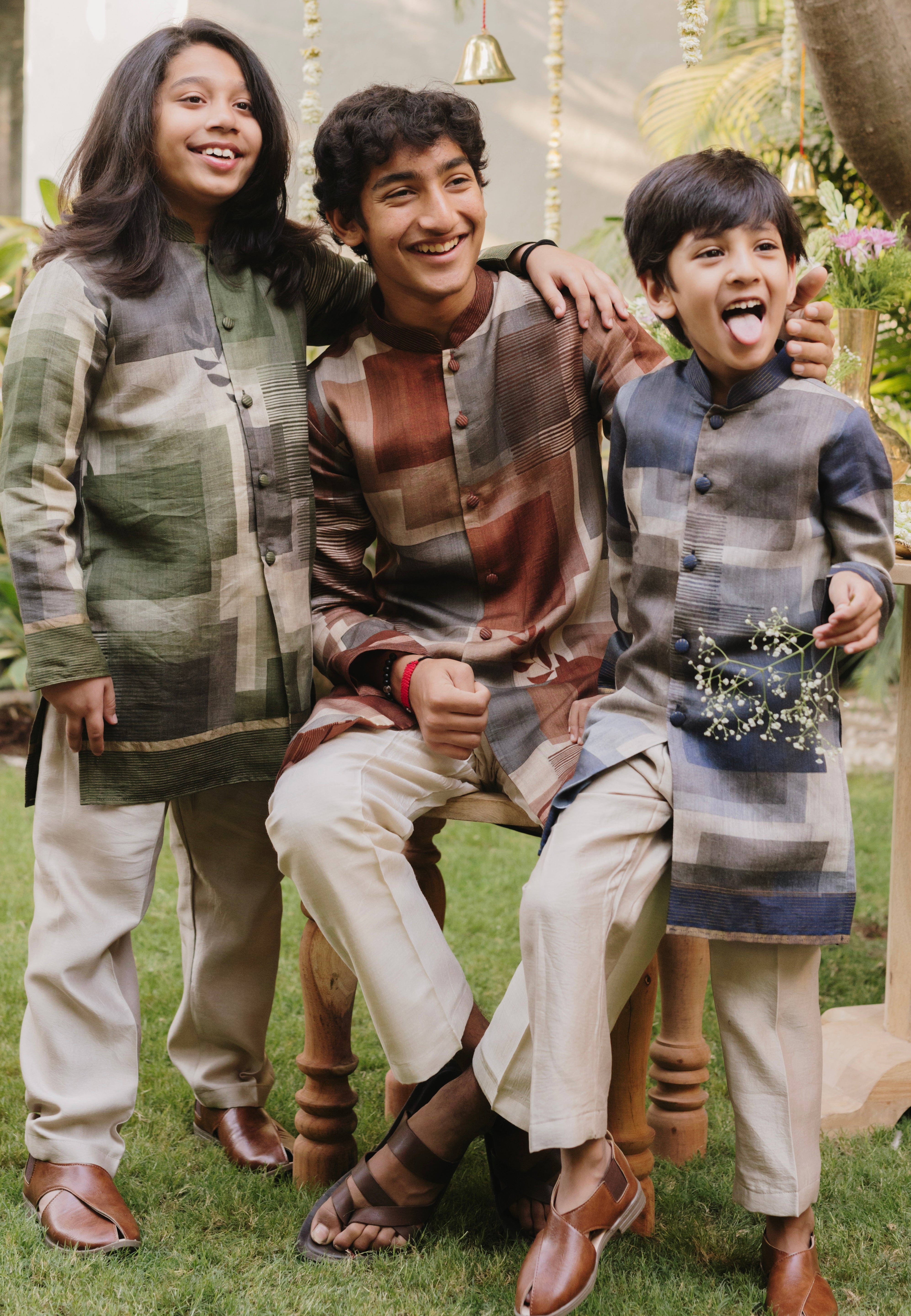 Made from naturally breathable Tassar, this front-open short kurta pairs effortlessly with a matching pajama. The silhouette is sharp yet easy to slip into, ideal for festive days when comfort and finish go hand in hand. Available in three deep, understated tones.
