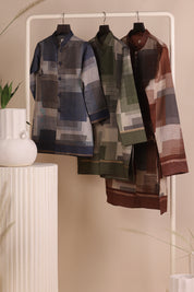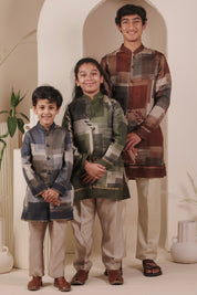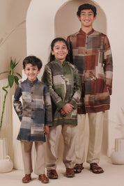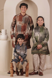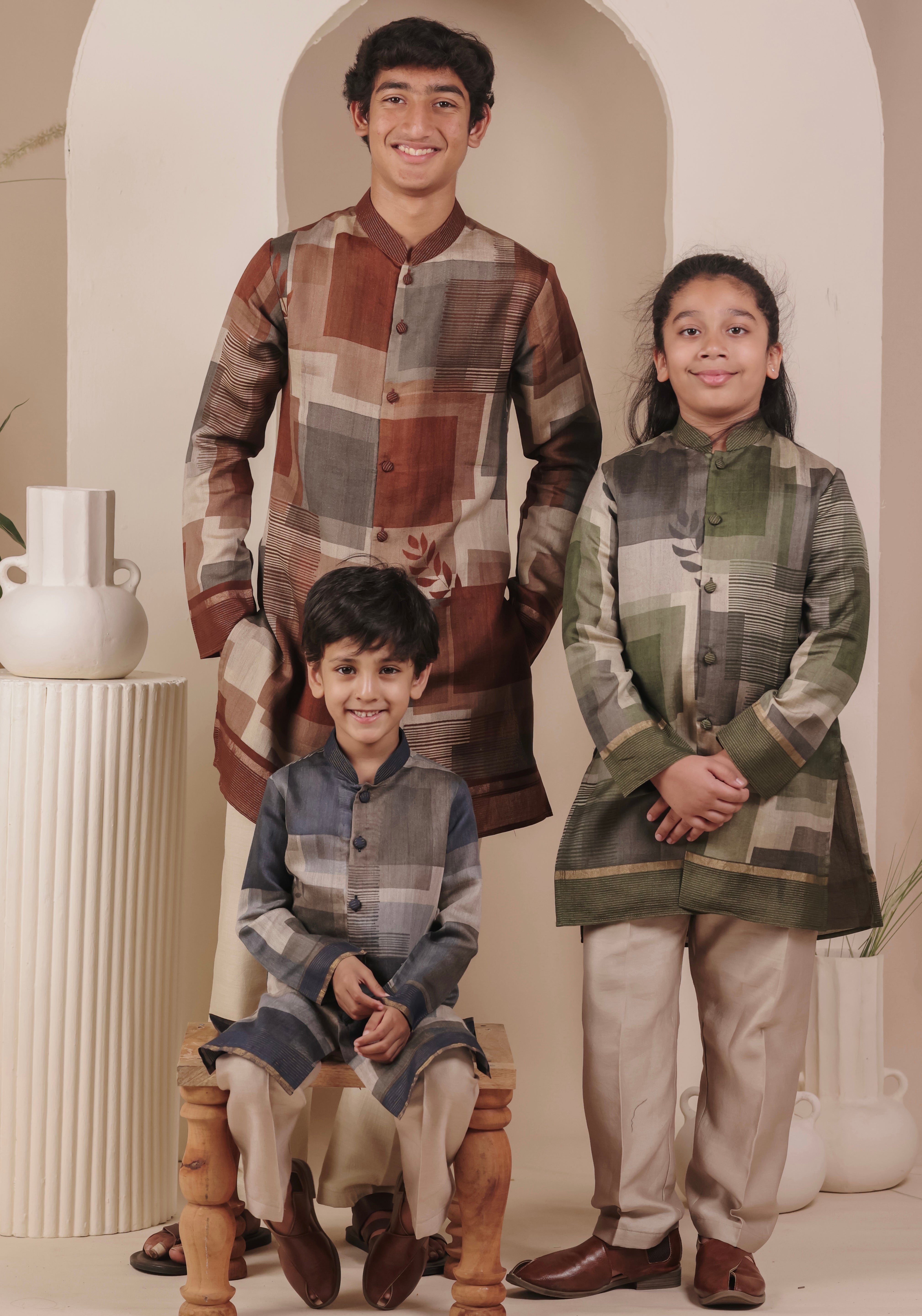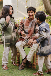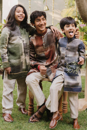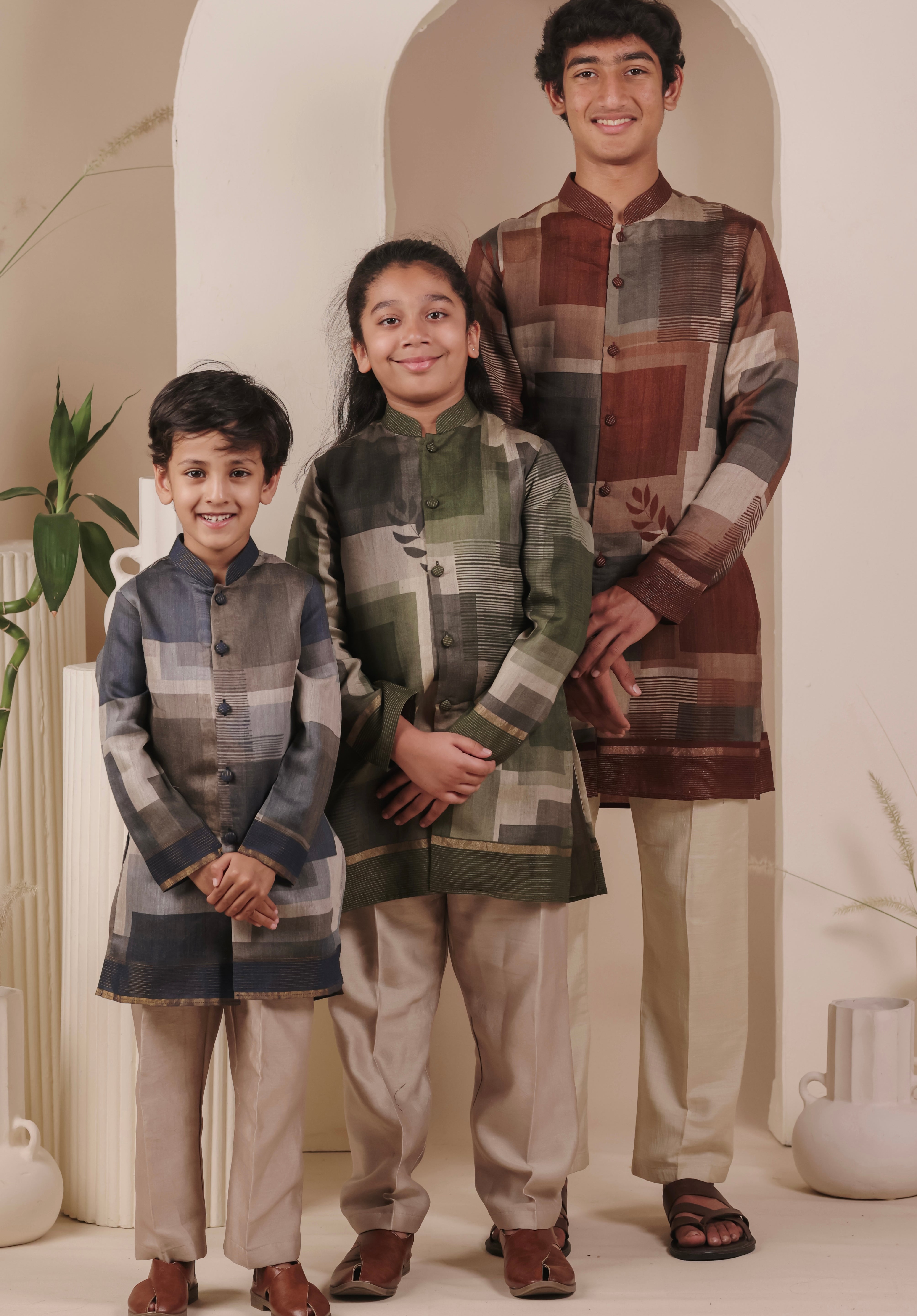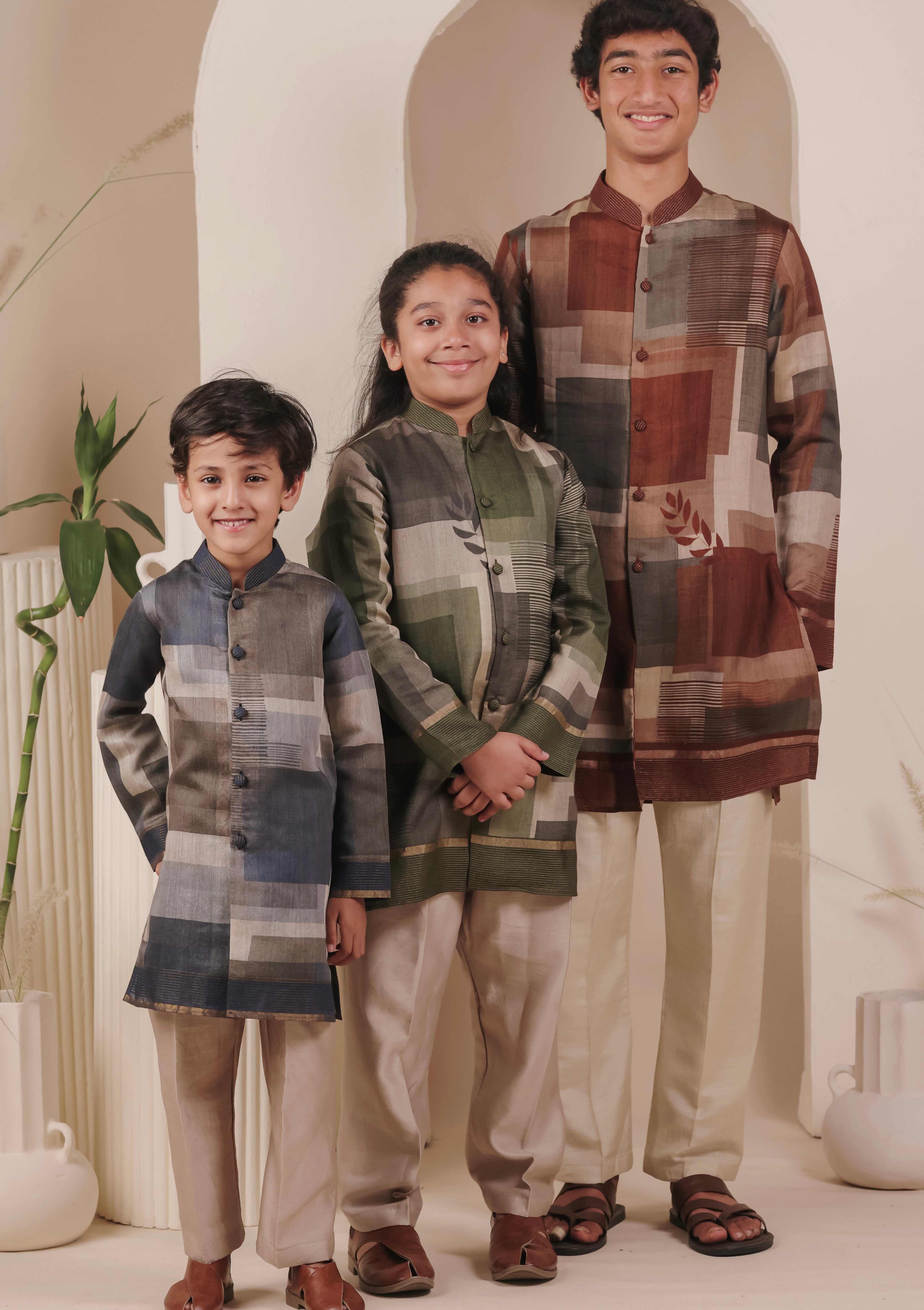 Made from naturally breathable Tassar, this front-open short kurta pairs effortlessly with a matching pajama. The silhouette is sharp yet easy to slip into, ideal for festive days when comfort and finish go hand in hand. Available in three deep, understated tones.