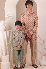 Featuring delicate handblock-inspired motifs, this front-open short kurta and pajama set brings a perfect blend of tradition and ease. Whether it's a celebration or a casual family get-together, this set is all about effortless elegance for the little men.
