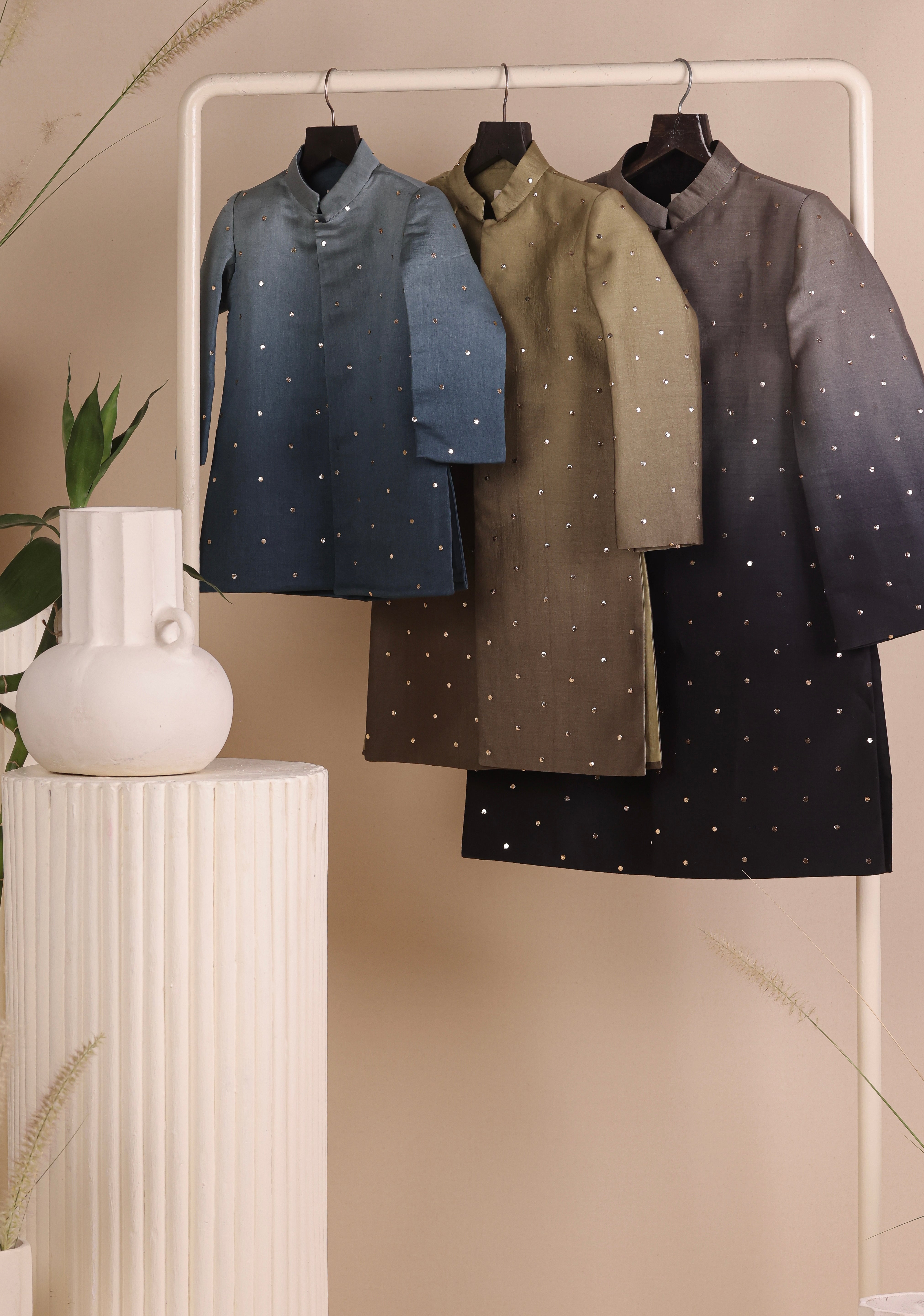An ombré canvas in muted, earthy tones sets the stage for intricate mukaish detailing in this Chanderi Achkan. With a coordinated pajama, the look is light, luminous, and occasion-ready.