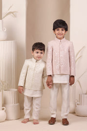 This embroidered Jodhpuri jacket glimmers gently with sequin detailing, paired with a soft-hued short kurta and pajama in a timeless contrast. Elegant and ideal for day-to-evening festivities.