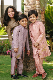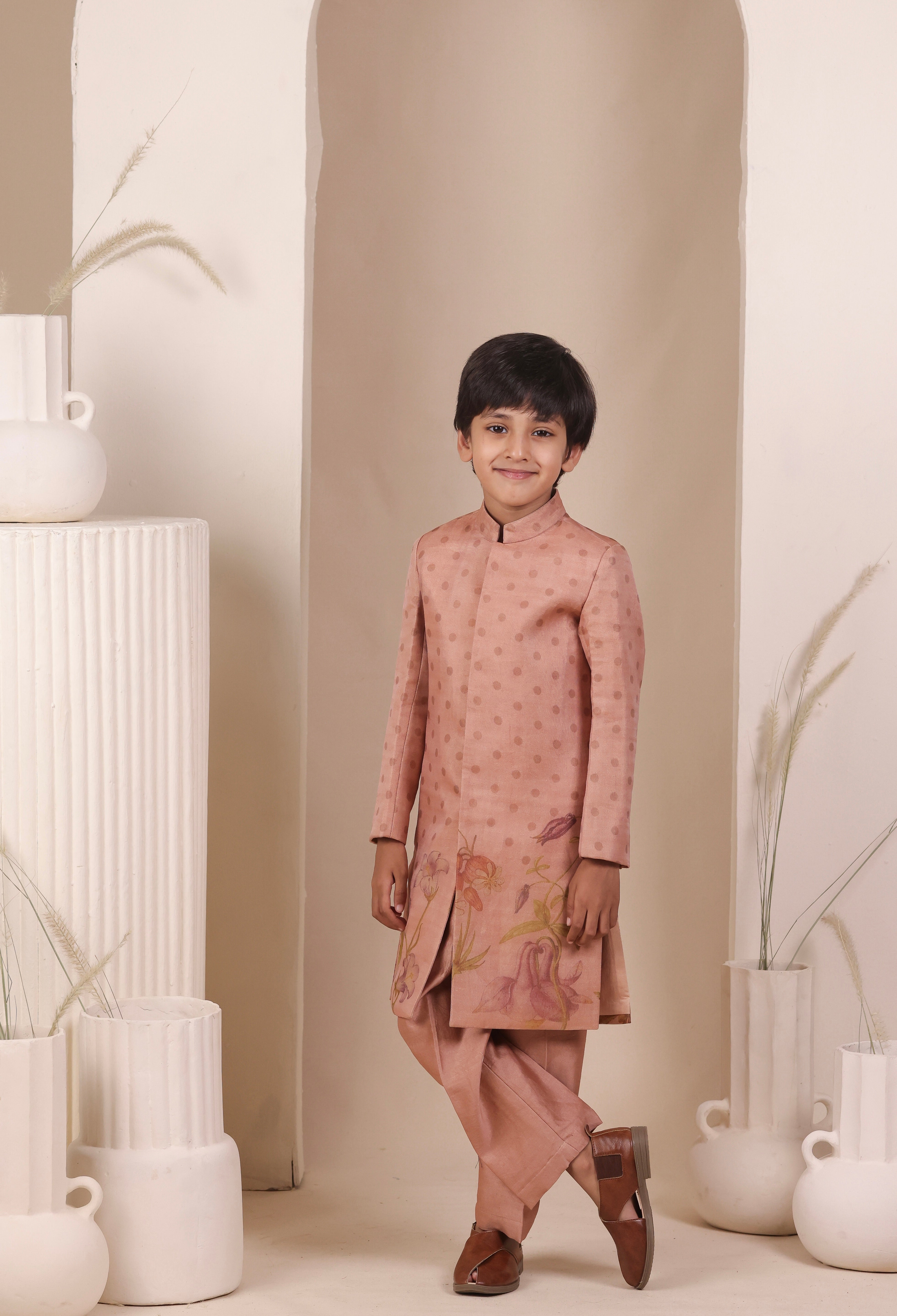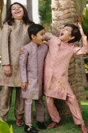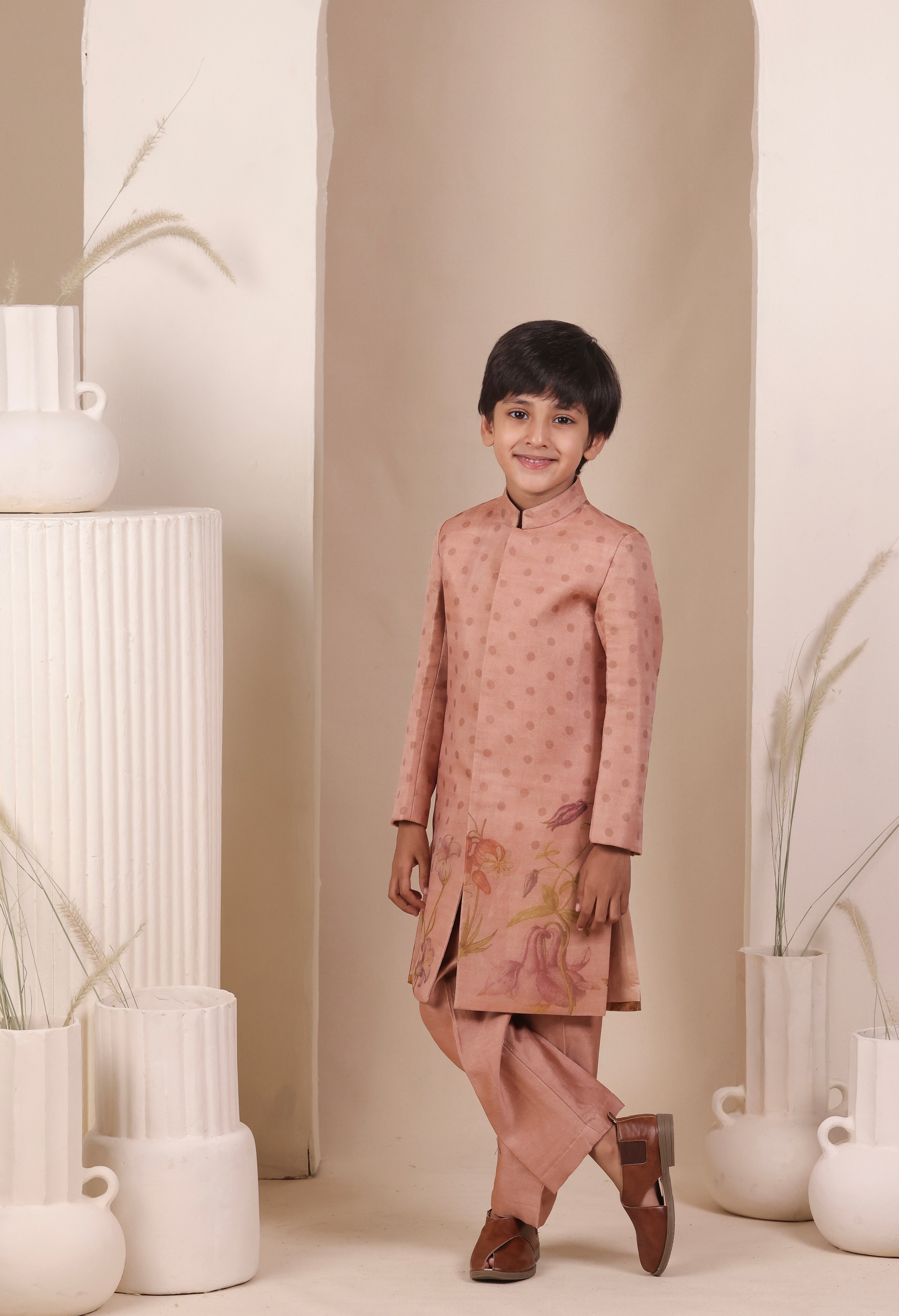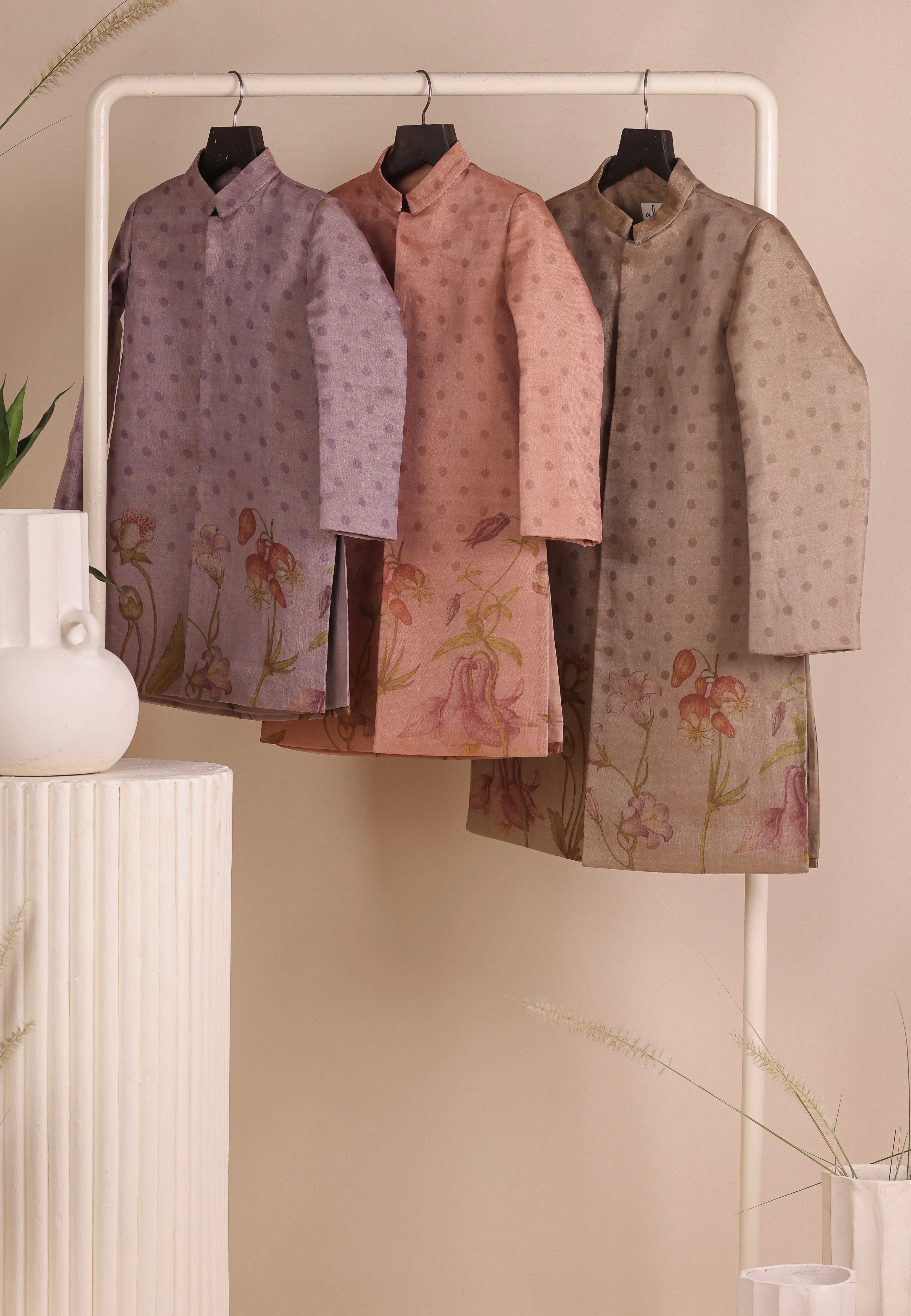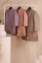 Tailored in rich tissue silk with delicate floral motifs, this Achkan Set brings a graceful depth to daytime festivities. Available in three pastel-earthy tones, it pairs seamlessly with a matching pajama for a cohesive, polished look.