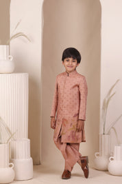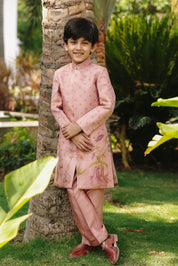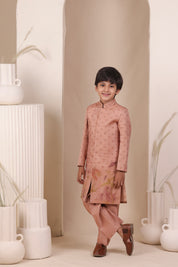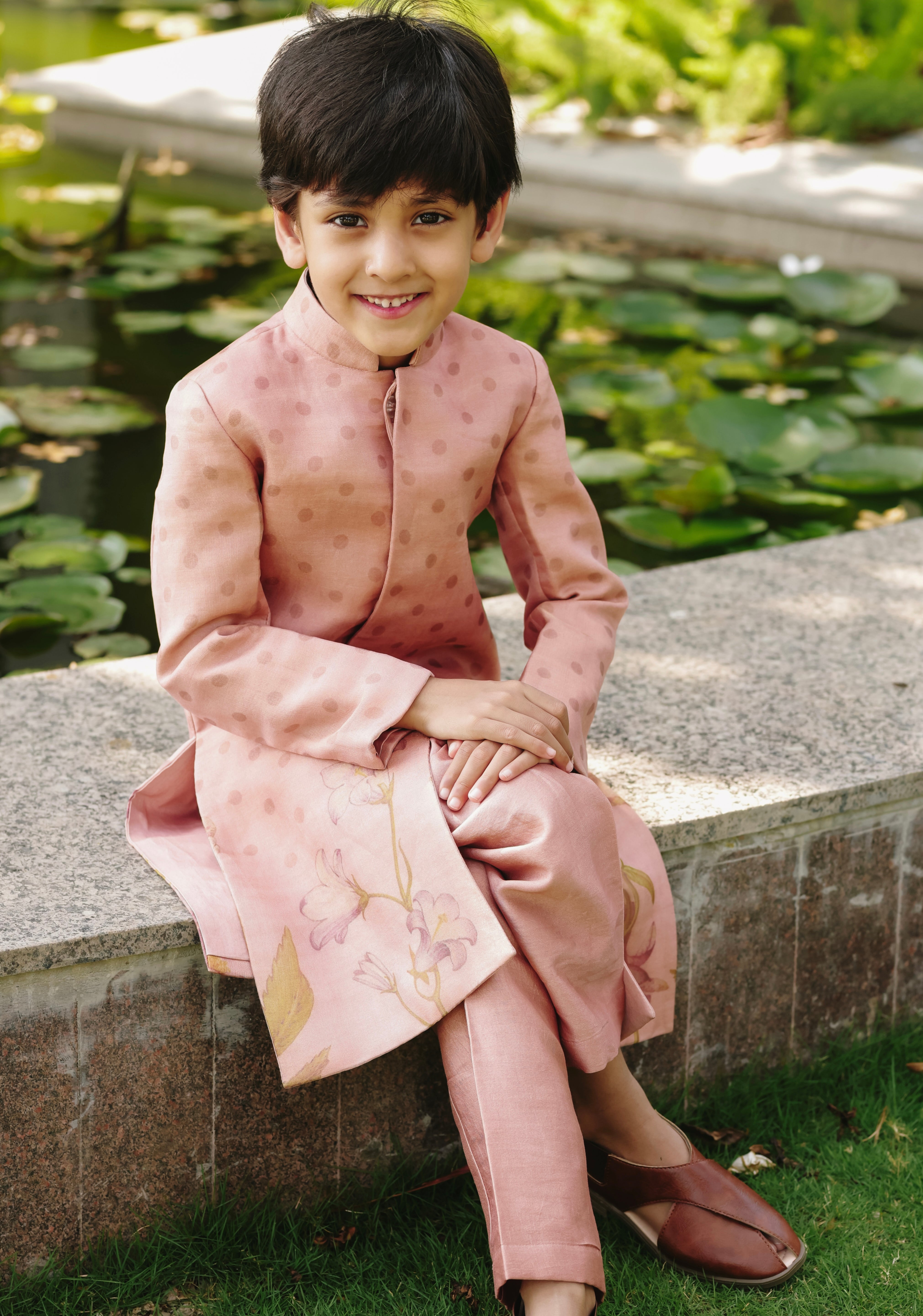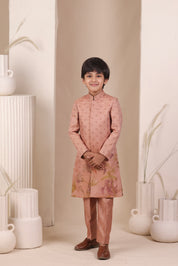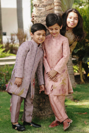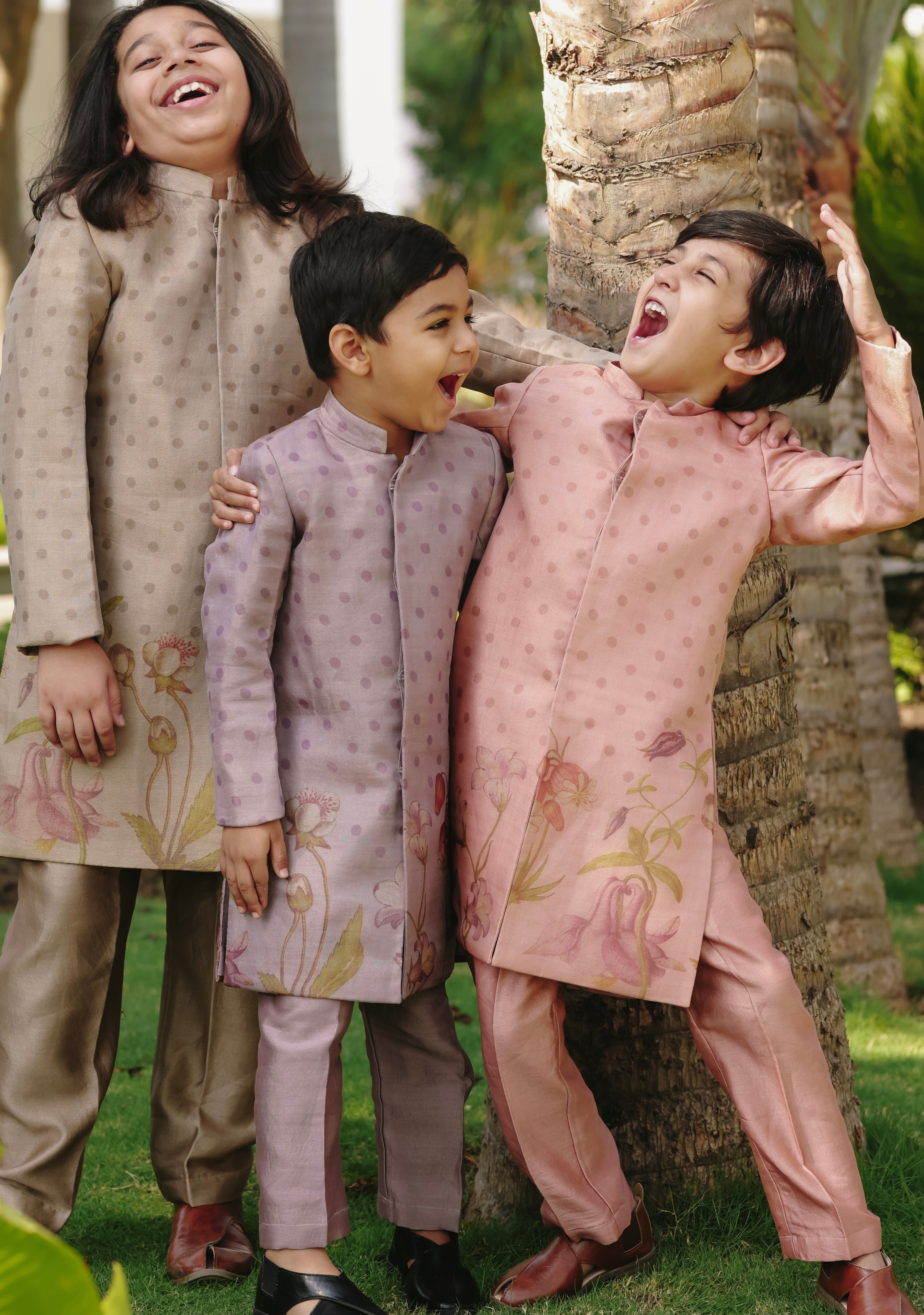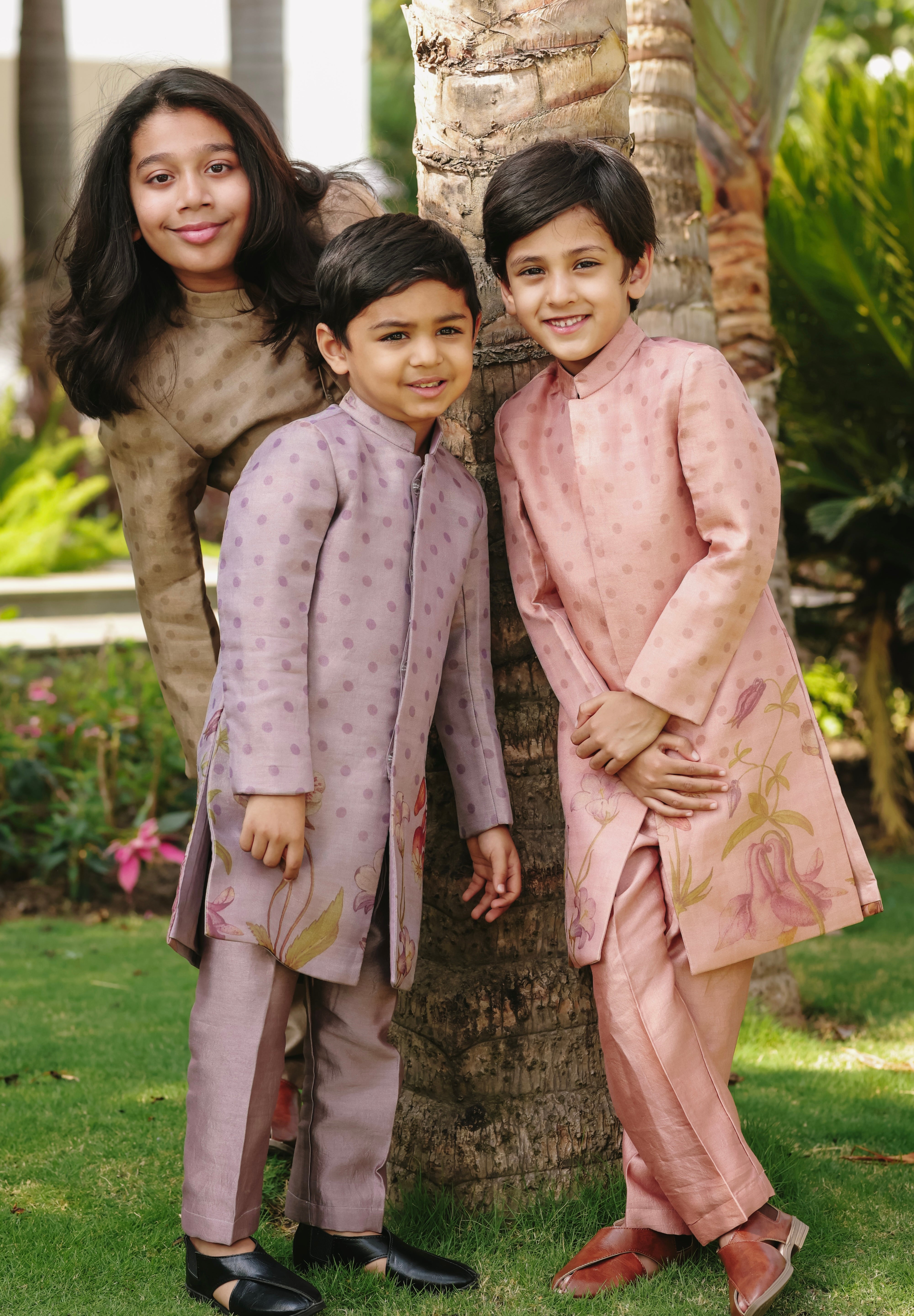 Tailored in rich tissue silk with delicate floral motifs, this Achkan Set brings a graceful depth to daytime festivities. Available in three pastel-earthy tones, it pairs seamlessly with a matching pajama for a cohesive, polished look.