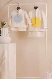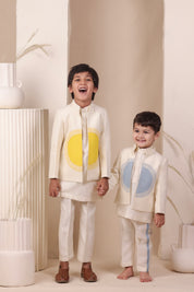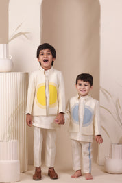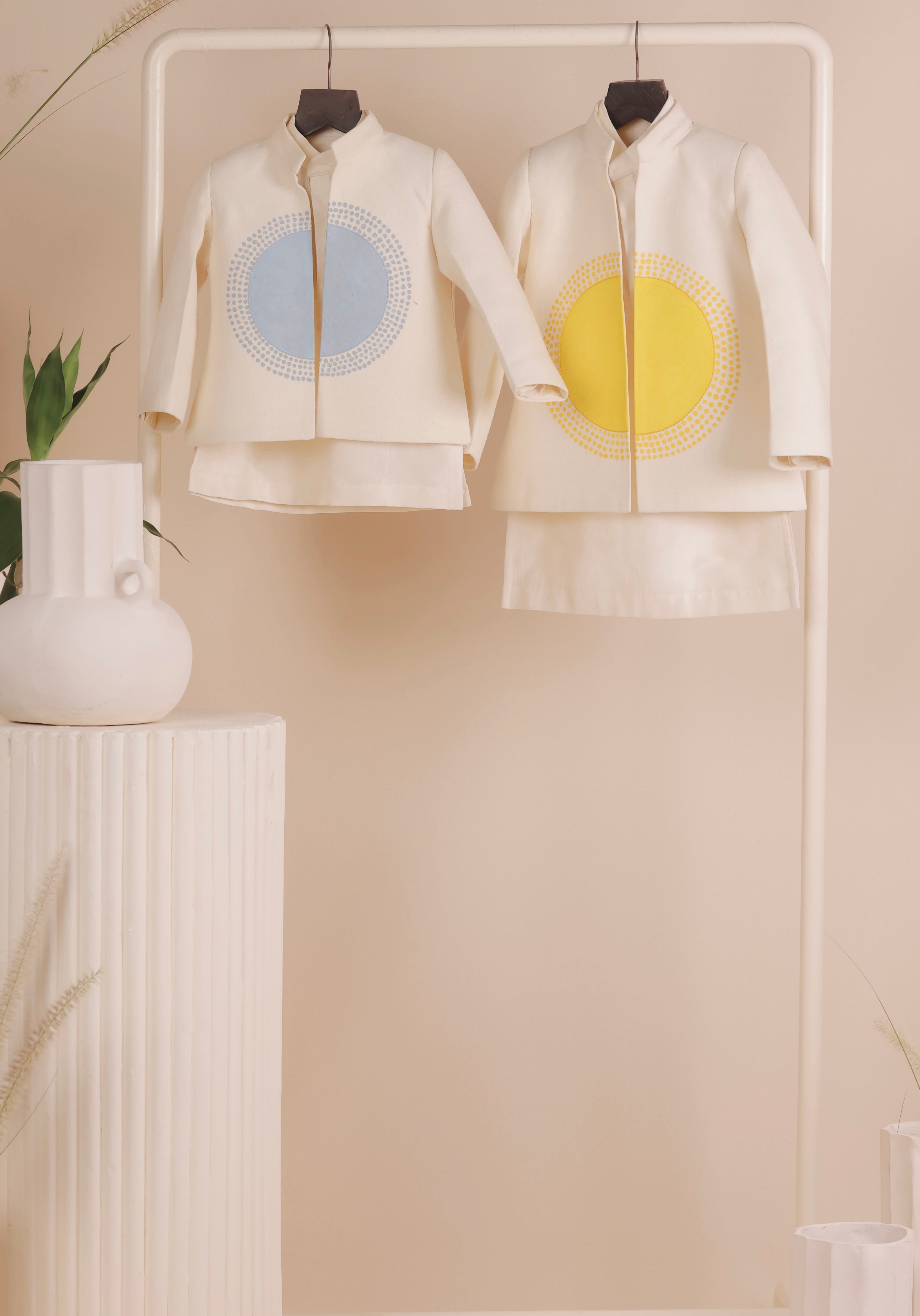 A hand-painted Matka jacket with bold circular art, paired with a short kurta and matching pants. Accented with side stripes, this set stands out for its clean lines and artisanal charm.