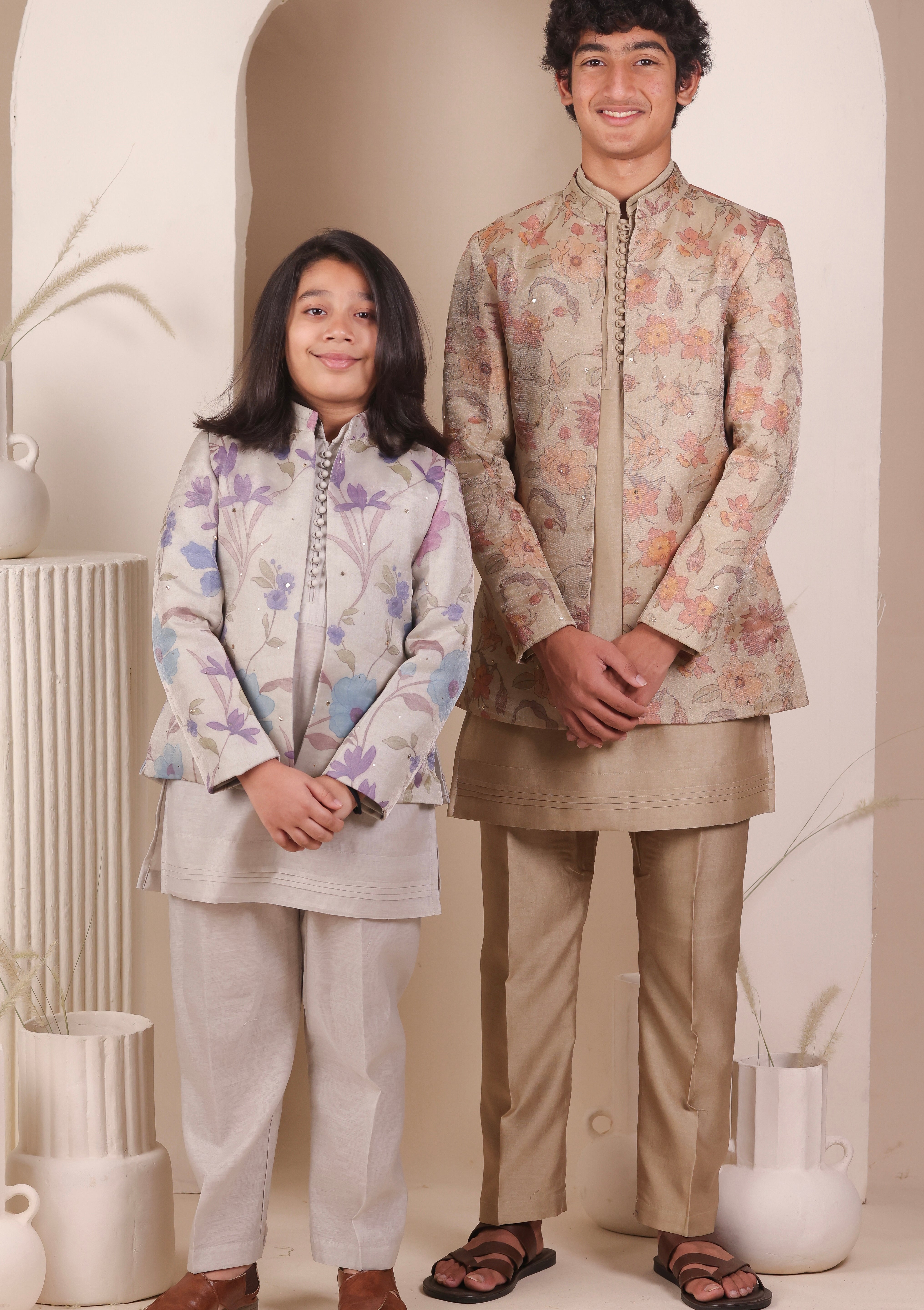 This open Jodhpuri jacket in floral-printed tissue is designed to feel light and breezy. Embellished with mukaish work and layered over a matching pleated short kurta and pajama, it's a graceful choice for daytime celebrations.